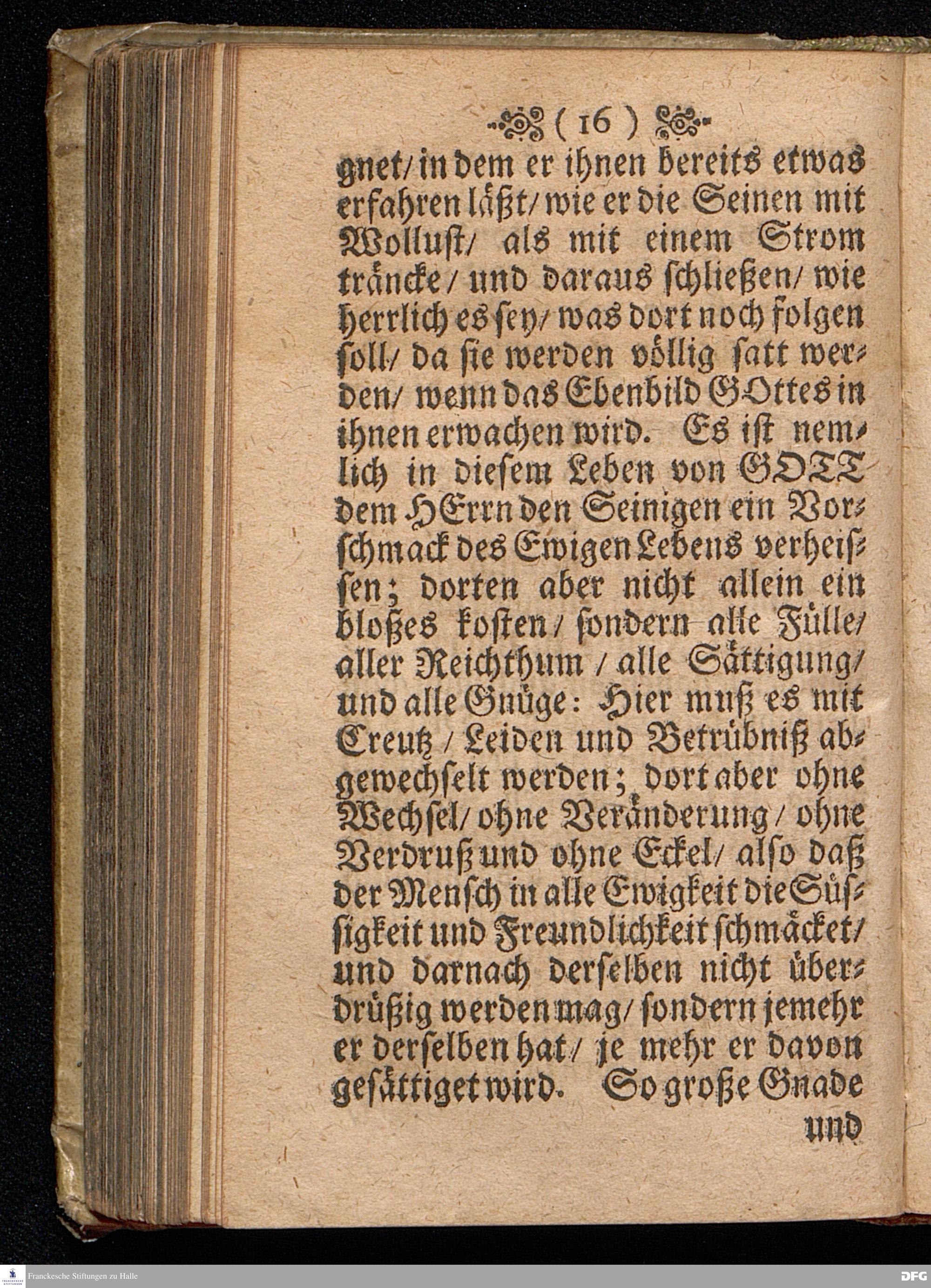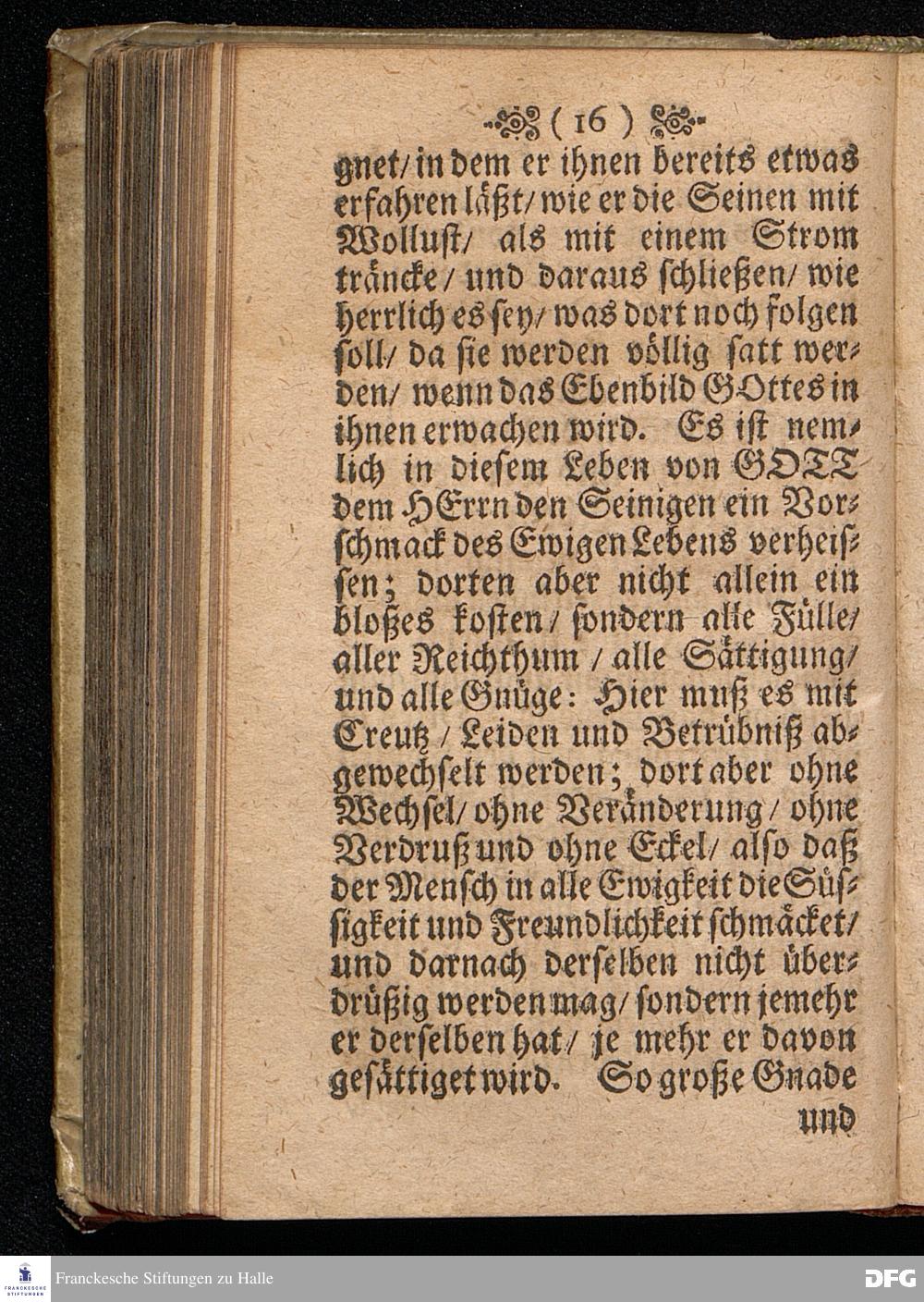 Der Vorschmack des ewigen Lebens / In einer Predigt Uber das Evangelium Matth.XVII, v.1==9, am 6.Sonntag nach Epiphan. Anno 1698, In der St.Georgen=Kirche zu Glaucha an Halle vorgestellet von M.August Hermann Francken / Gr.& OO.LL.P.P.& P.Glauch. HALLE / Gedruckt bey Christian Henckel / Univers.Buchdr.1698.