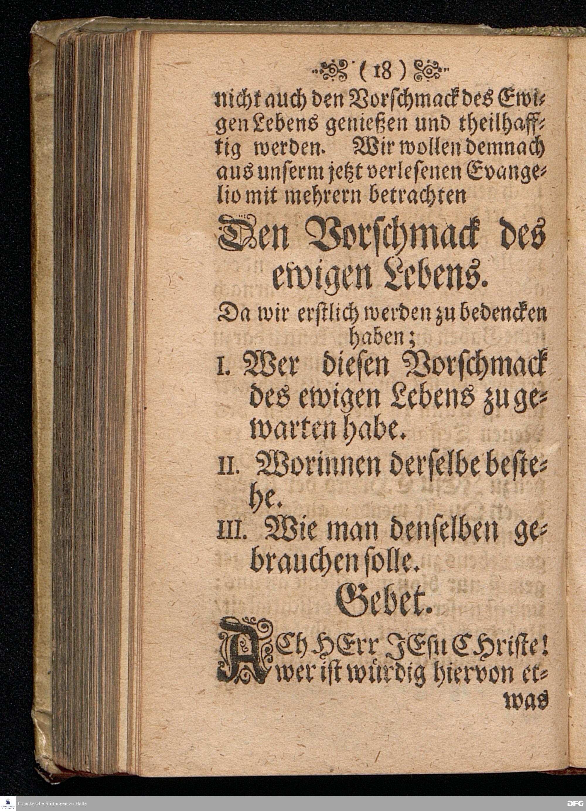 Der Vorschmack des ewigen Lebens / In einer Predigt Uber das Evangelium Matth.XVII, v.1==9, am 6.Sonntag nach Epiphan. Anno 1698, In der St.Georgen=Kirche zu Glaucha an Halle vorgestellet von M.August Hermann Francken / Gr.& OO.LL.P.P.& P.Glauch. HALLE / Gedruckt bey Christian Henckel / Univers.Buchdr.1698.
