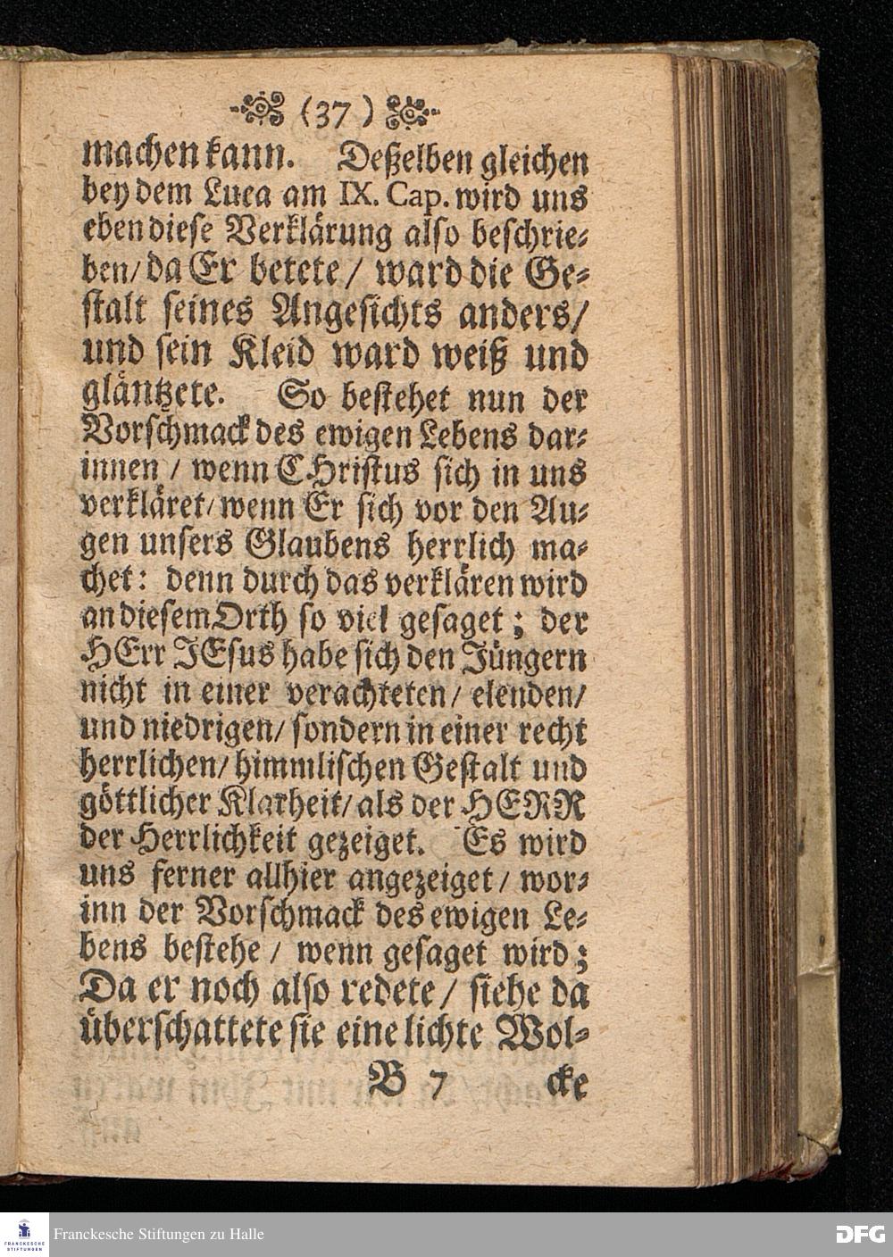 Der Vorschmack des ewigen Lebens / In einer Predigt Uber das Evangelium Matth.XVII, v.1==9, am 6.Sonntag nach Epiphan. Anno 1698, In der St.Georgen=Kirche zu Glaucha an Halle vorgestellet von M.August Hermann Francken / Gr.& OO.LL.P.P.& P.Glauch. HALLE / Gedruckt bey Christian Henckel / Univers.Buchdr.1698.