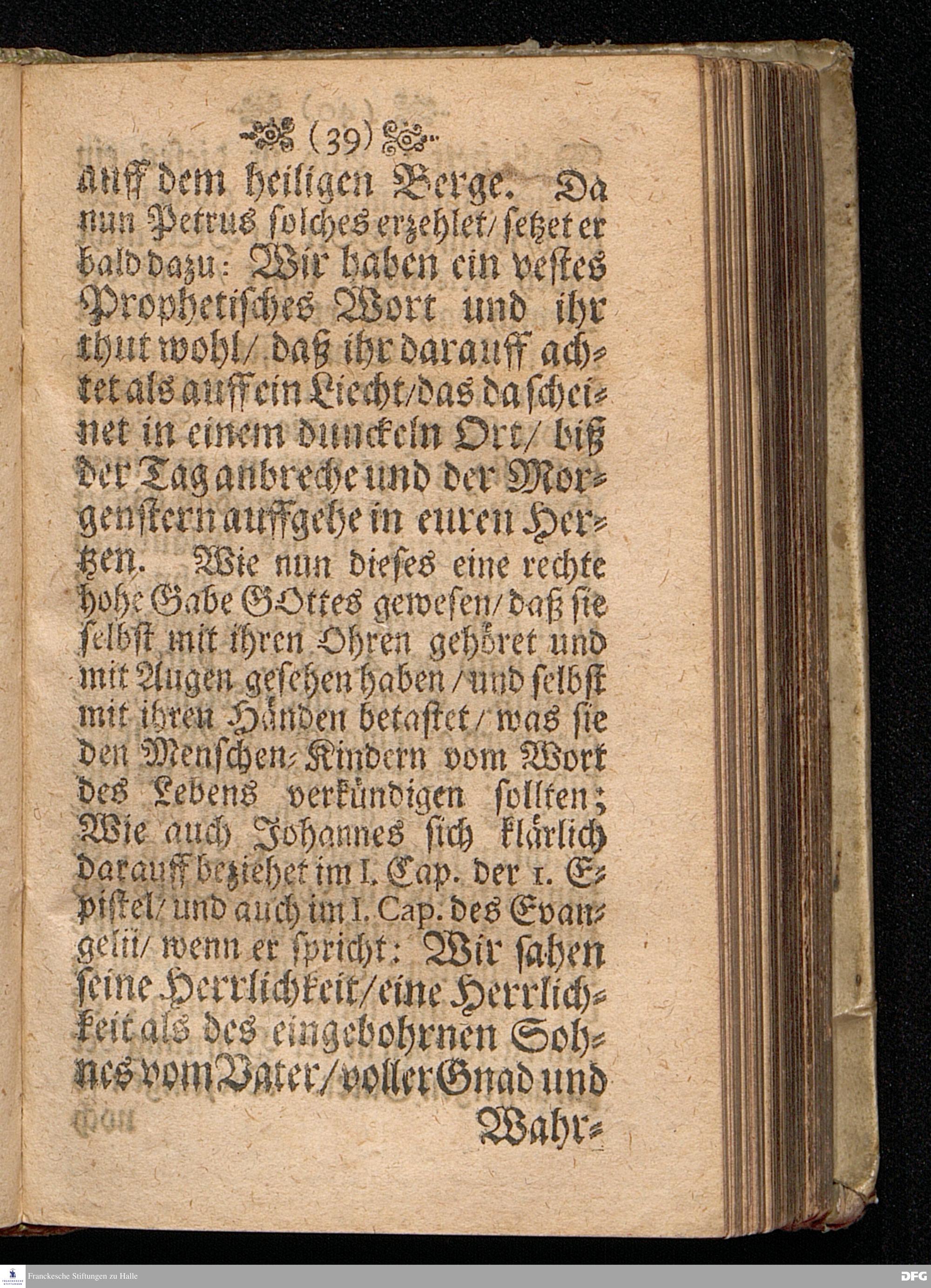 Der Vorschmack des ewigen Lebens / In einer Predigt Uber das Evangelium Matth.XVII, v.1==9, am 6.Sonntag nach Epiphan. Anno 1698, In der St.Georgen=Kirche zu Glaucha an Halle vorgestellet von M.August Hermann Francken / Gr.& OO.LL.P.P.& P.Glauch. HALLE / Gedruckt bey Christian Henckel / Univers.Buchdr.1698.