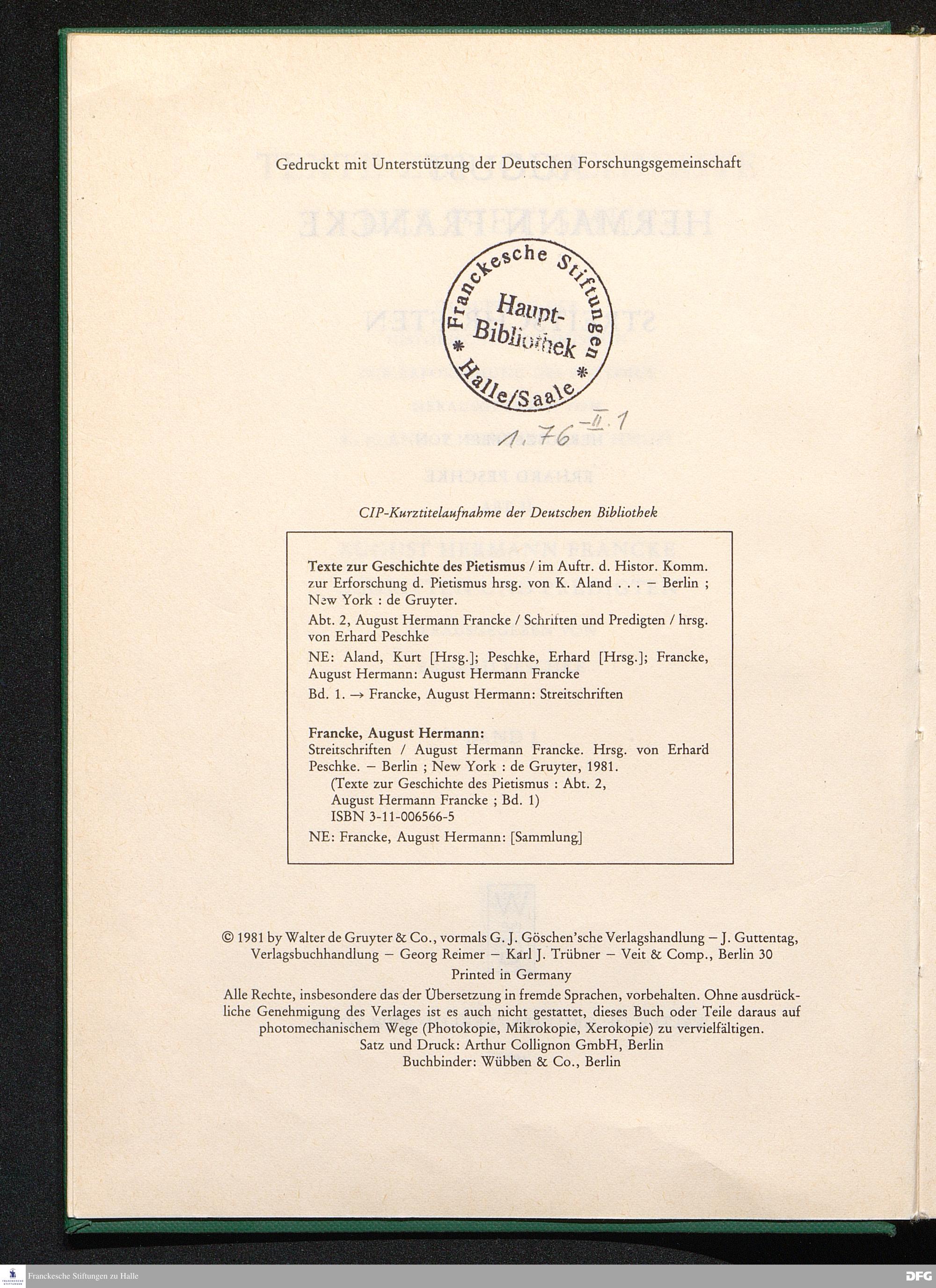 Abt. 2, Bd. 1 (1981) Streitschriften / August Hermann Francke. Hrsg. von Erhard Peschke