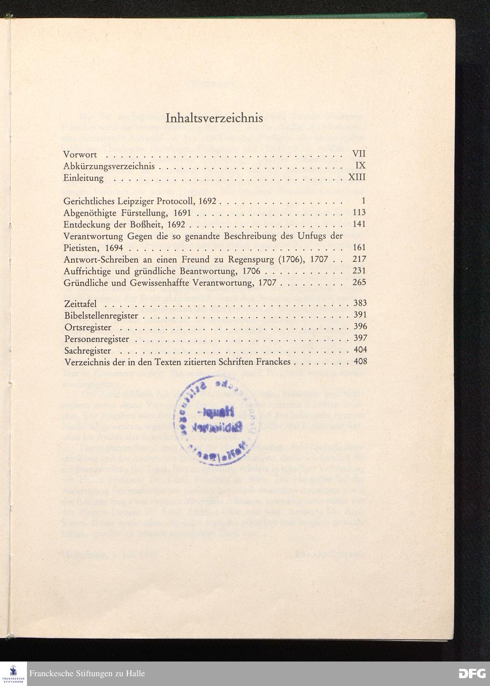 August Hermann Franckens, S. Theol. Prof. zu Halle und Past. zu Glaucha vor Halle, Gründliche und Gewissenhafte Verantwortung gegen Hn. D. Johann Friedrich Mayers, Professoris Theologi auff der Universität zu Greiffswald, harte und unwahrhaffte Beschuldigungen ...