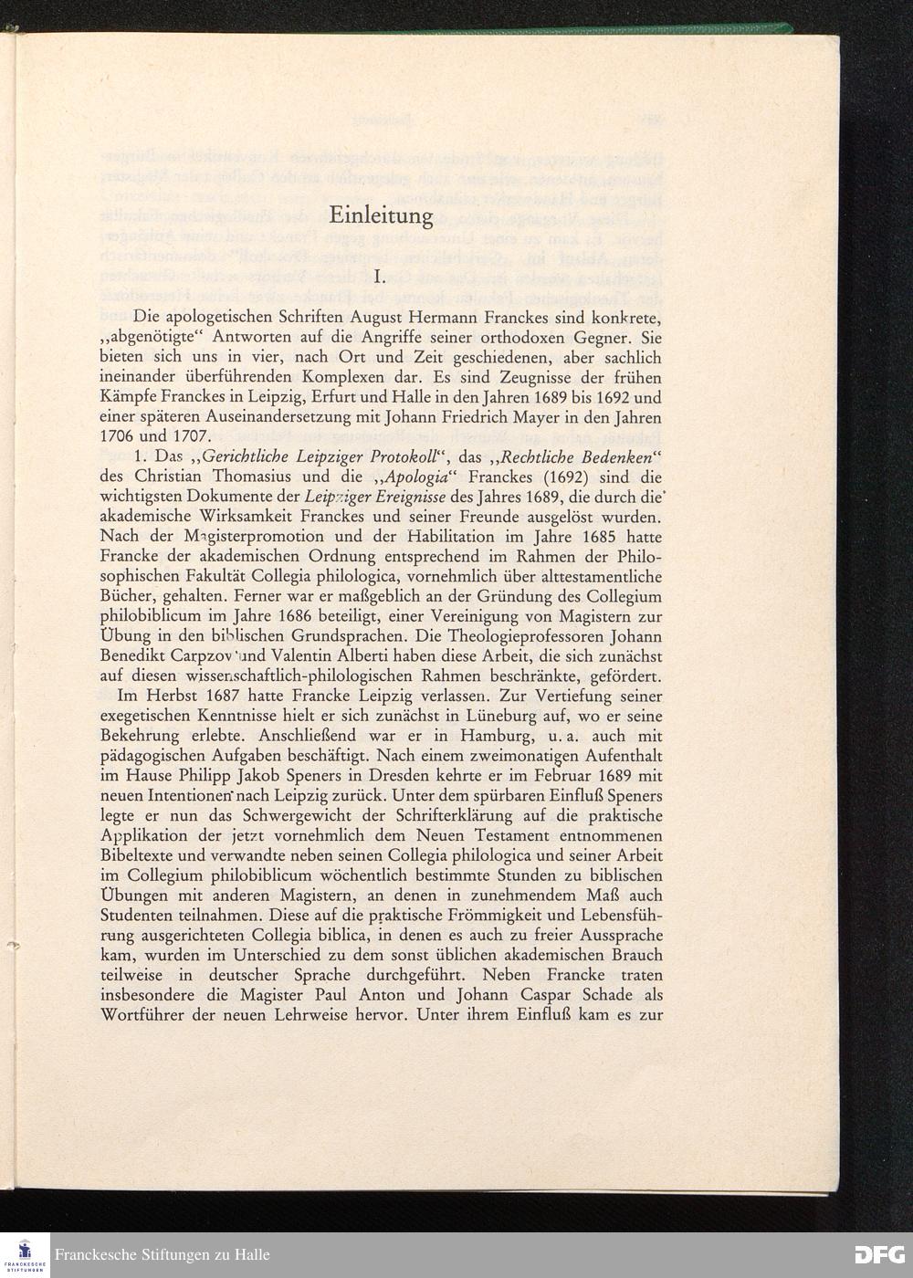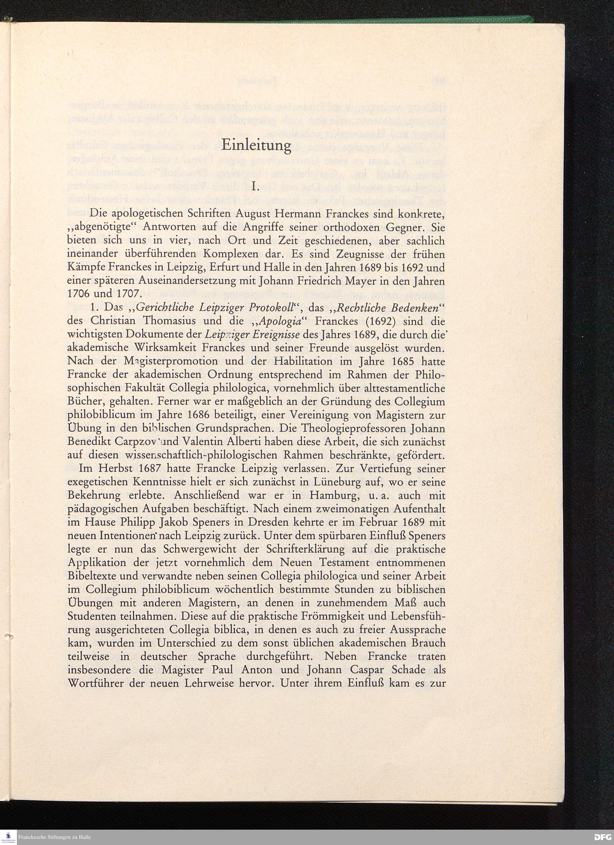 Gerichtliches Leipziger Protocoll In Sachen die so genannten Pietisten betreffend/ Samt Hn. Christian Thomasii. berümten JC. Rechtlichem Bedencken darüber; Und zu Ende beygefügter Apologia Oder Defensions-Schrifft Hn. M. Augusti Hermanni Franckens ...