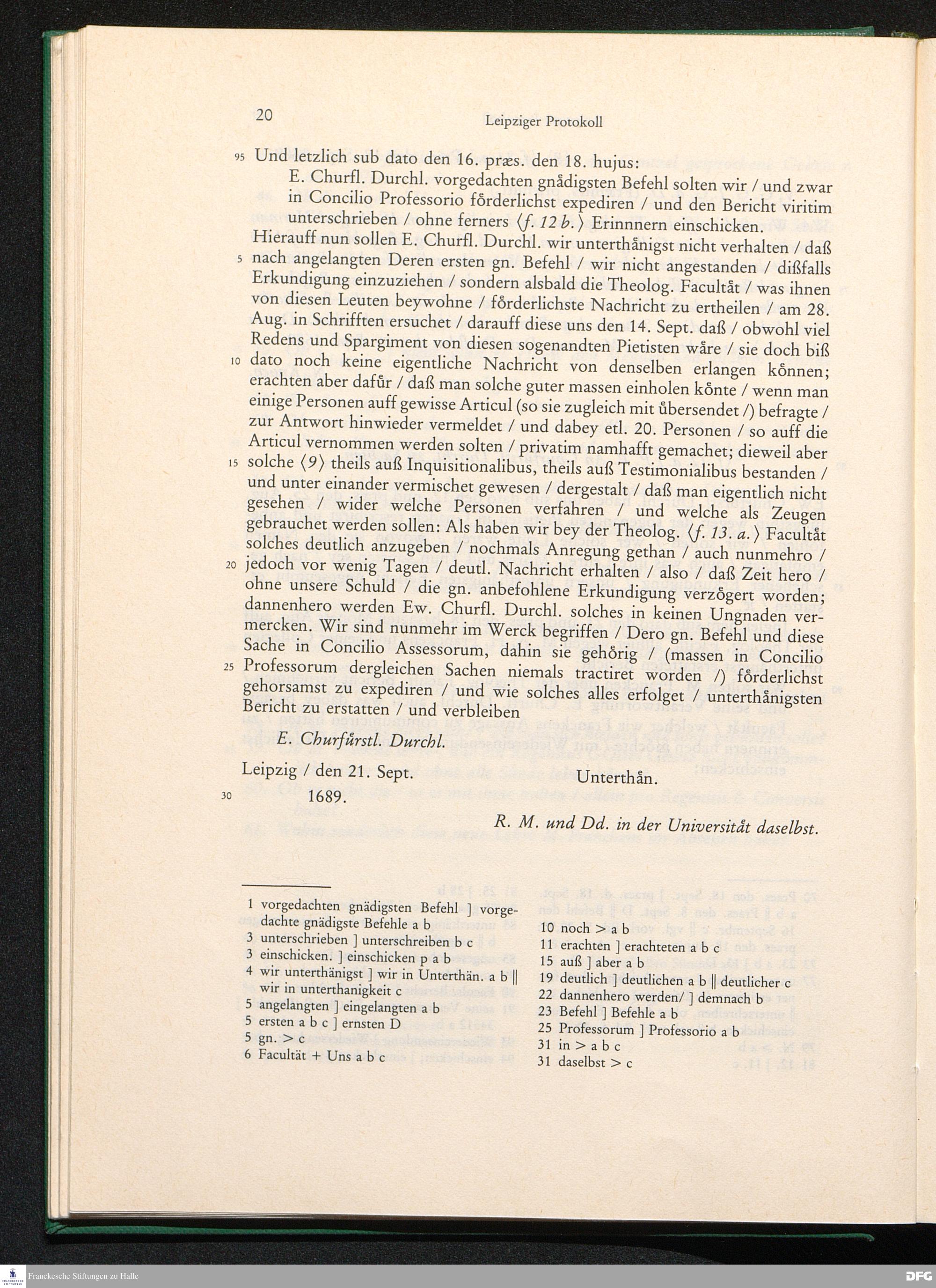 Gerichtliches Leipziger Protocoll In Sachen die so genannten Pietisten betreffend/ Samt Hn. Christian Thomasii. berümten JC. Rechtlichem Bedencken darüber; Und zu Ende beygefügter Apologia Oder Defensions-Schrifft Hn. M. Augusti Hermanni Franckens ...