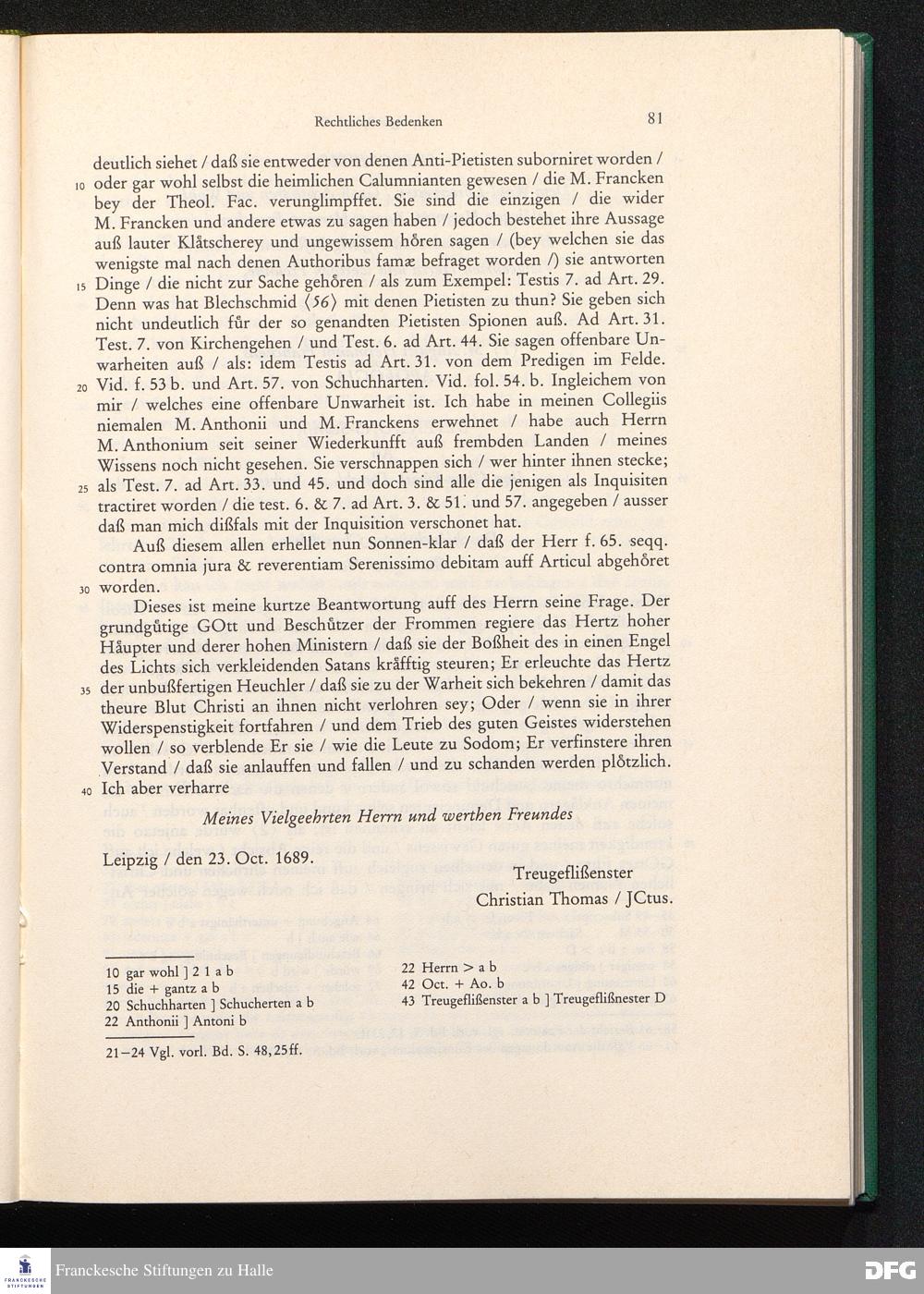Gerichtliches Leipziger Protocoll In Sachen die so genannten Pietisten betreffend/ Samt Hn. Christian Thomasii. berümten JC. Rechtlichem Bedencken darüber; Und zu Ende beygefügter Apologia Oder Defensions-Schrifft Hn. M. Augusti Hermanni Franckens ...