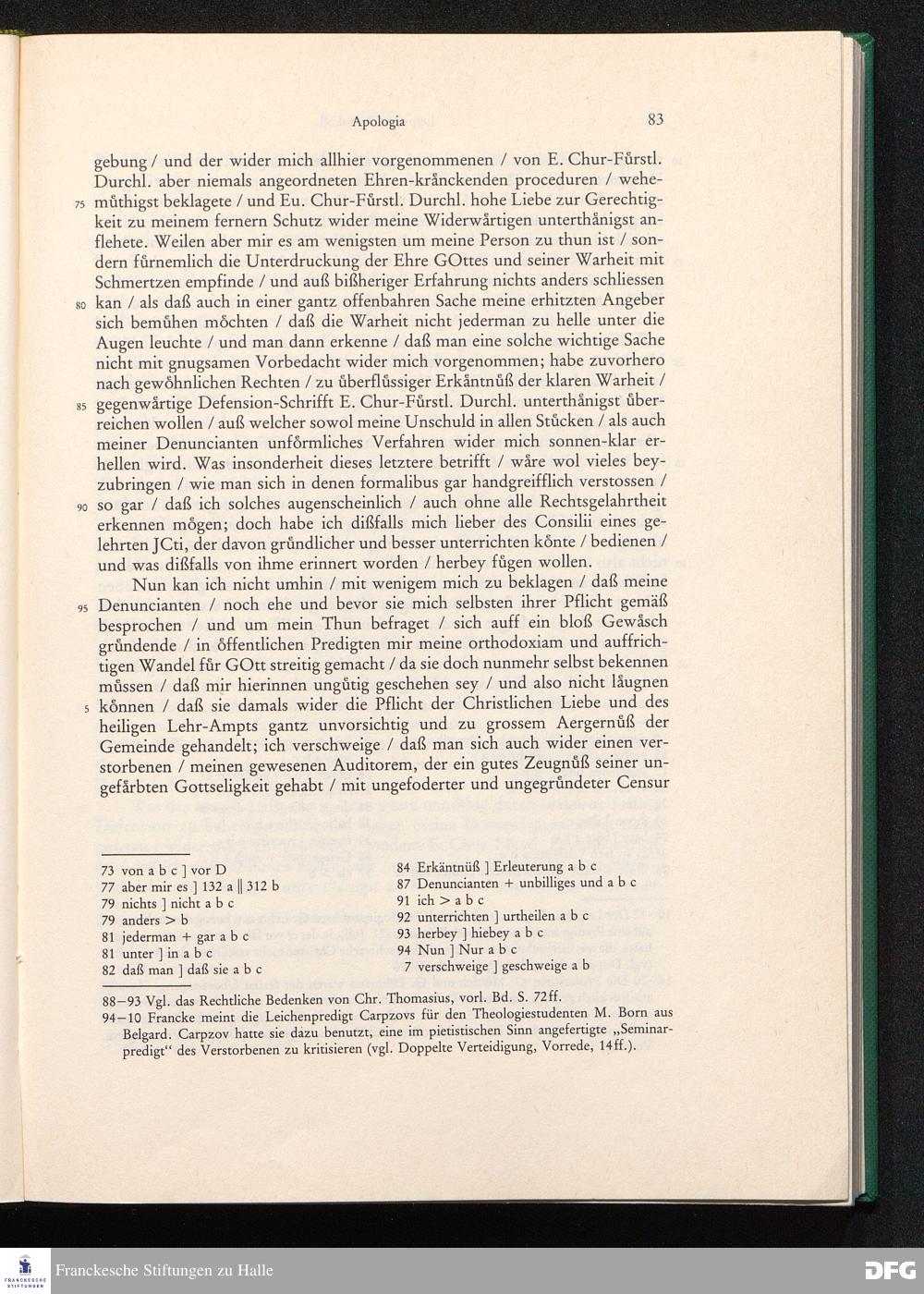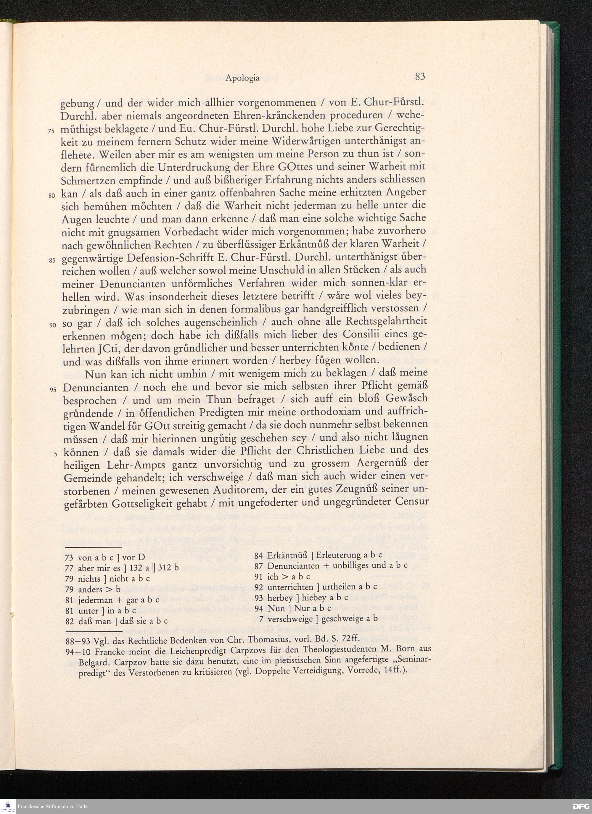 Gerichtliches Leipziger Protocoll In Sachen die so genannten Pietisten betreffend/ Samt Hn. Christian Thomasii. berümten JC. Rechtlichem Bedencken darüber; Und zu Ende beygefügter Apologia Oder Defensions-Schrifft Hn. M. Augusti Hermanni Franckens ...