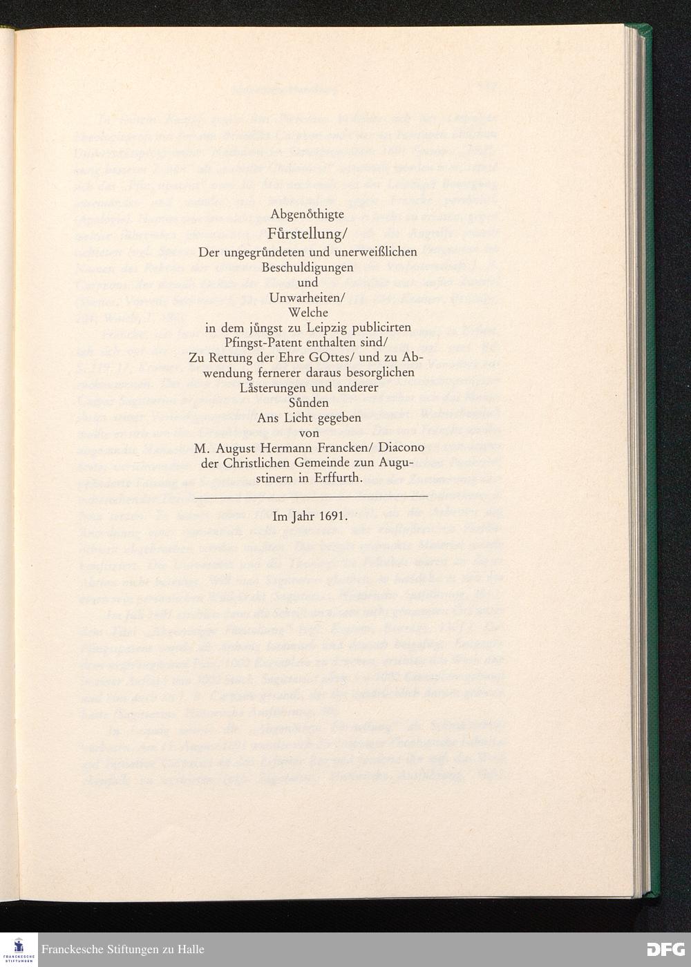 August Hermann Franckens, S. Theol. Prof. zu Halle und Past. zu Glaucha vor Halle, Gründliche und Gewissenhafte Verantwortung gegen Hn. D. Johann Friedrich Mayers, Professoris Theologi auff der Universität zu Greiffswald, harte und unwahrhaffte Beschuldigungen ...
