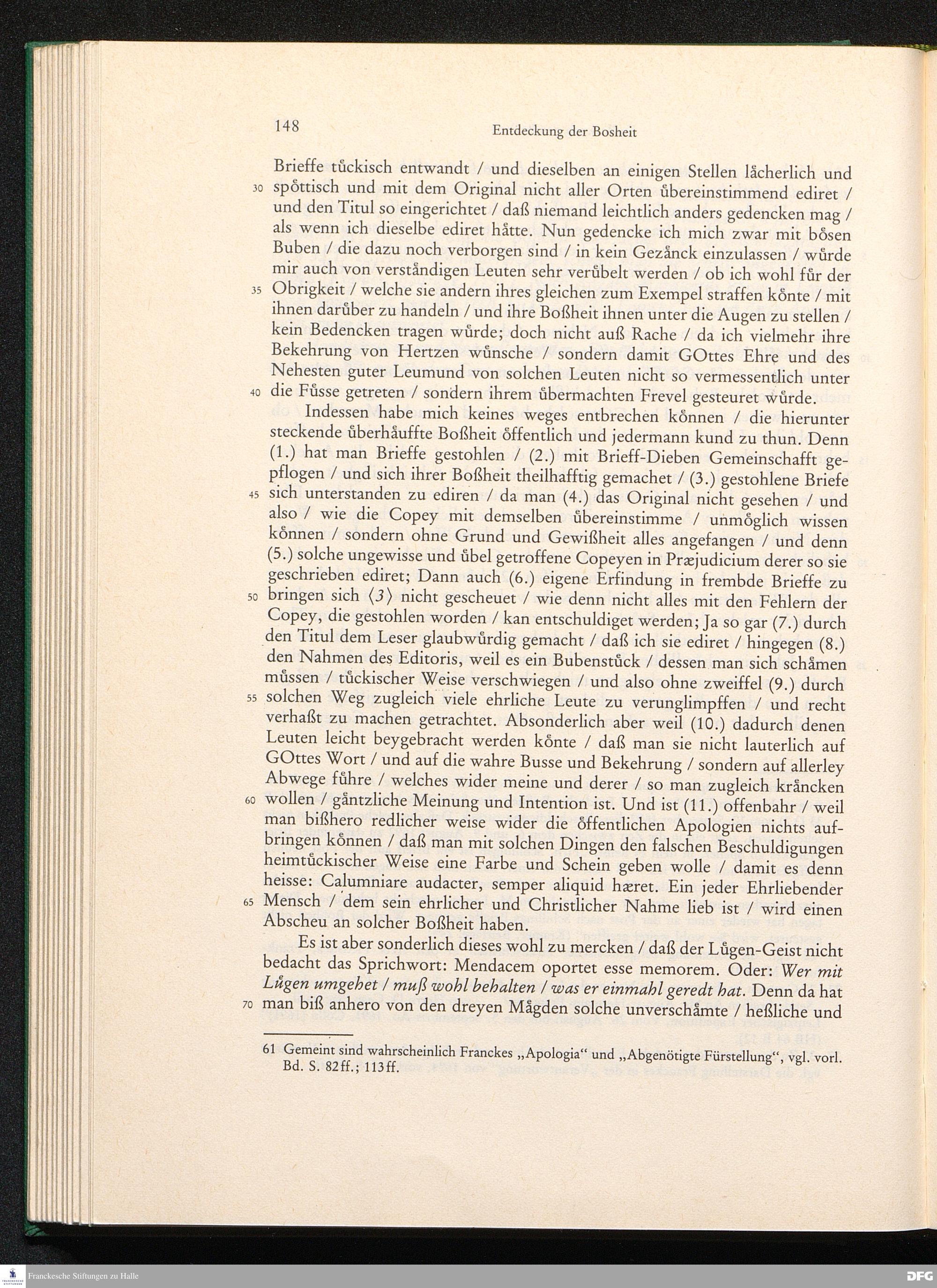 August Hermann Franckens, S. Theol. Prof. zu Halle und Past. zu Glaucha vor Halle, Gründliche und Gewissenhafte Verantwortung gegen Hn. D. Johann Friedrich Mayers, Professoris Theologi auff der Universität zu Greiffswald, harte und unwahrhaffte Beschuldigungen ...