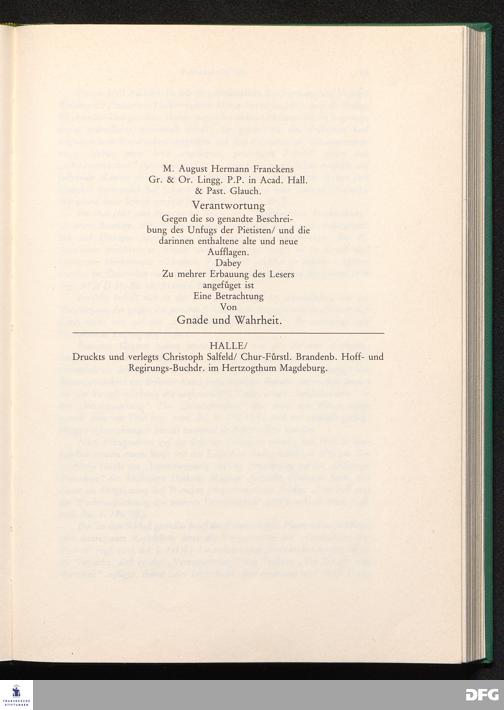 August Hermann Franckens, S. Theol. Prof. zu Halle und Past. zu Glaucha vor Halle, Gründliche und Gewissenhafte Verantwortung gegen Hn. D. Johann Friedrich Mayers, Professoris Theologi auff der Universität zu Greiffswald, harte und unwahrhaffte Beschuldigungen ...