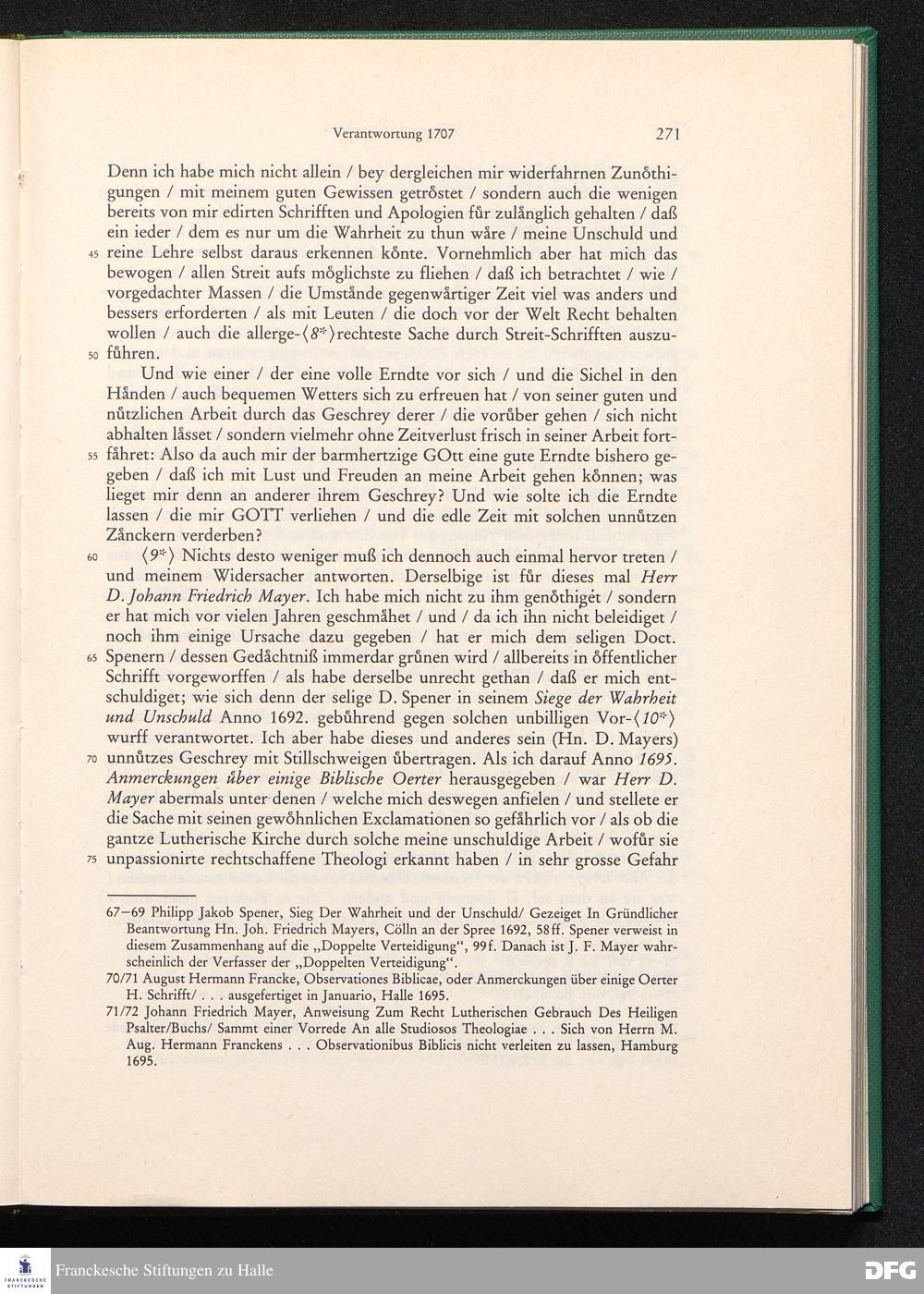 August Hermann Franckens, S. Theol. Prof. zu Halle und Past. zu Glaucha vor Halle, Gründliche und Gewissenhafte Verantwortung gegen Hn. D. Johann Friedrich Mayers, Professoris Theologi auff der Universität zu Greiffswald, harte und unwahrhaffte Beschuldigungen ...