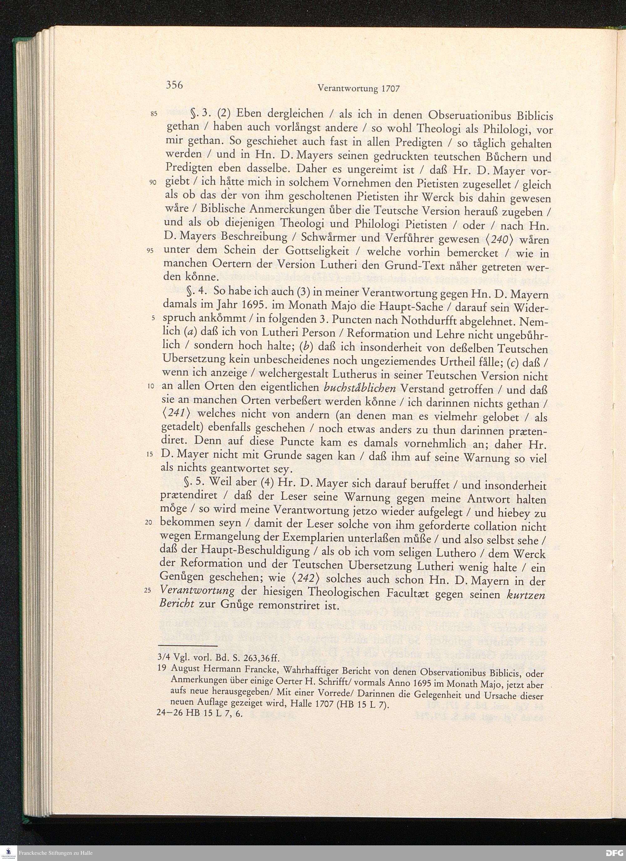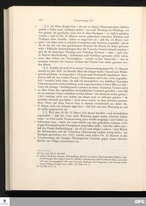August Hermann Franckens, S. Theol. Prof. zu Halle und Past. zu Glaucha vor Halle, Gründliche und Gewissenhafte Verantwortung gegen Hn. D. Johann Friedrich Mayers, Professoris Theologi auff der Universität zu Greiffswald, harte und unwahrhaffte Beschuldigungen ...