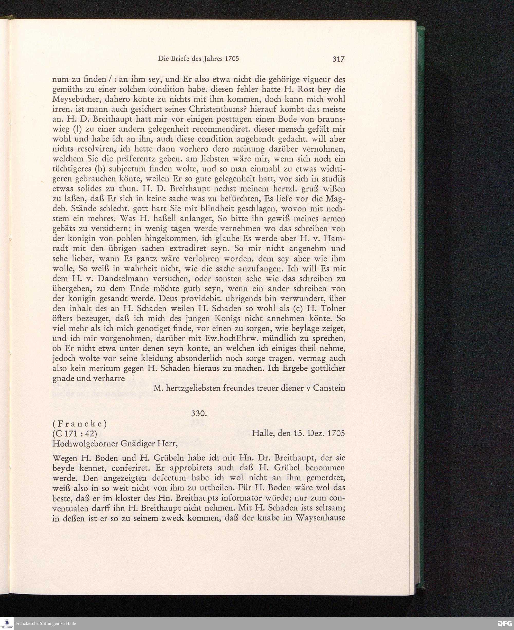Nr. 330 A. H. Francke an C. H. von Canstein 15.12.1705