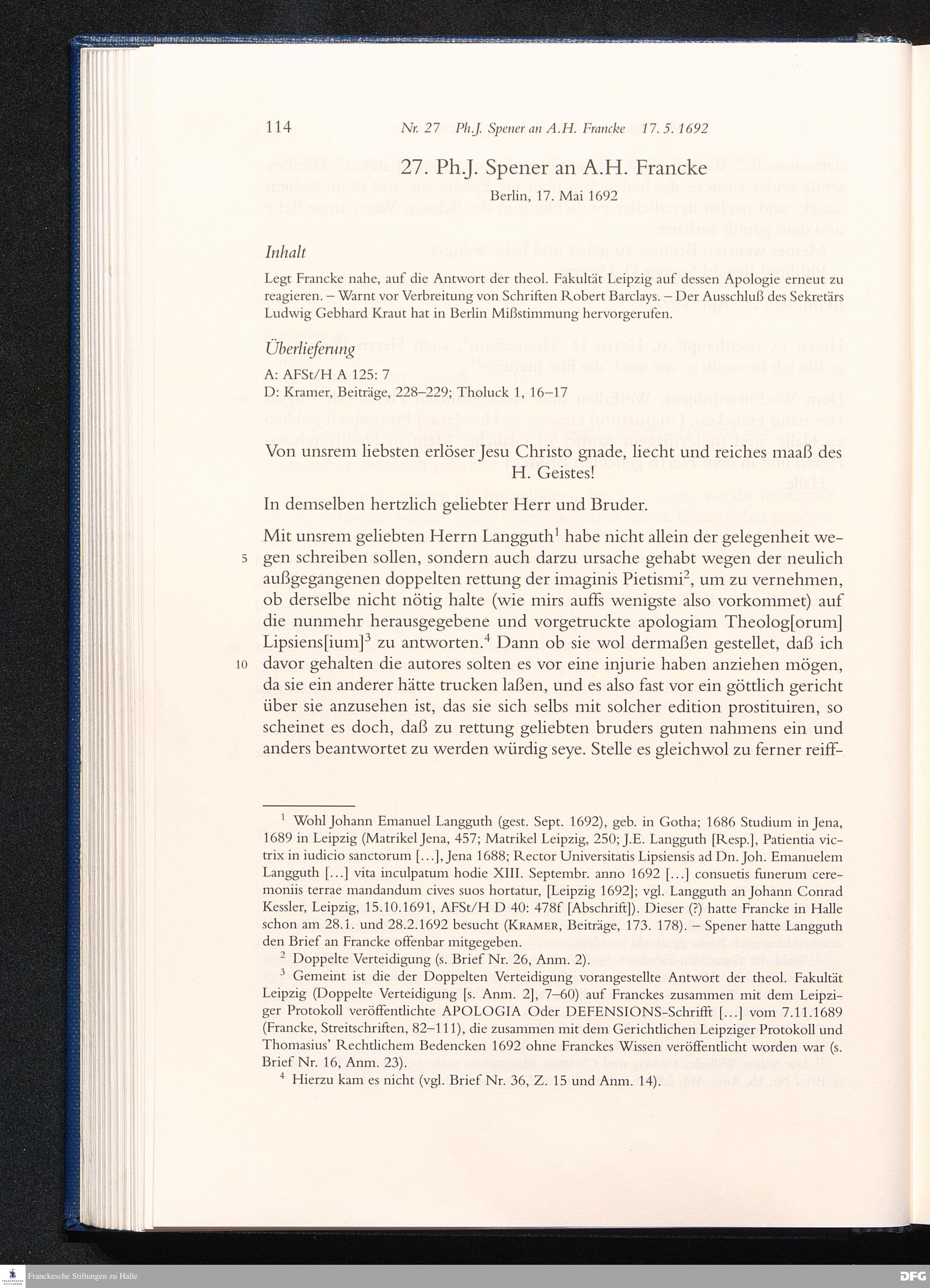 Briefwechsel mit August Hermann Francke : 1689 - 1704 / Philipp Jakob Spener. Hrsg. von Johannes Wallmann ... in Zsarb. mit Veronika Albrecht-Birkner
