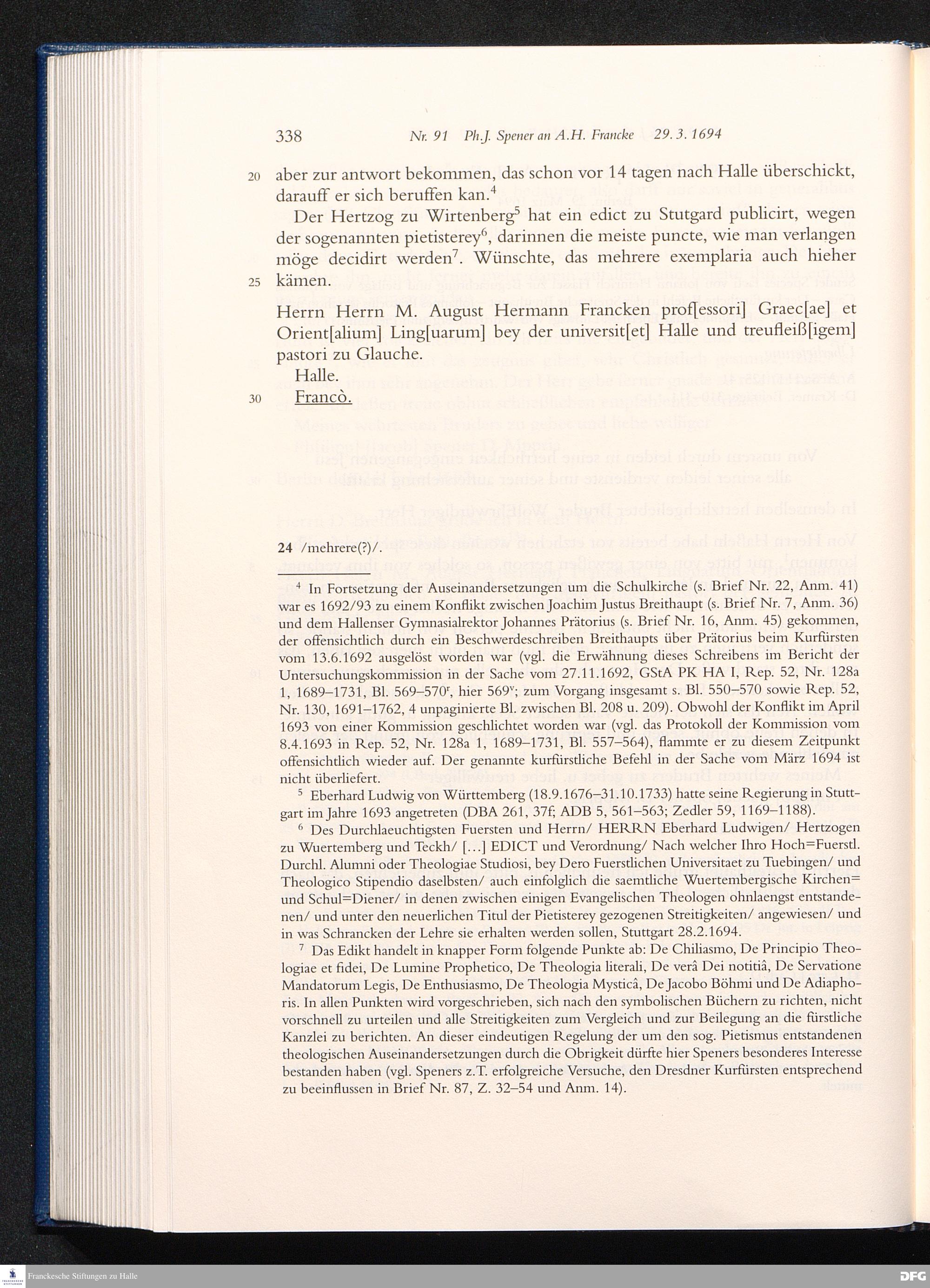 Briefwechsel mit August Hermann Francke : 1689 - 1704 / Philipp Jakob Spener. Hrsg. von Johannes Wallmann ... in Zsarb. mit Veronika Albrecht-Birkner