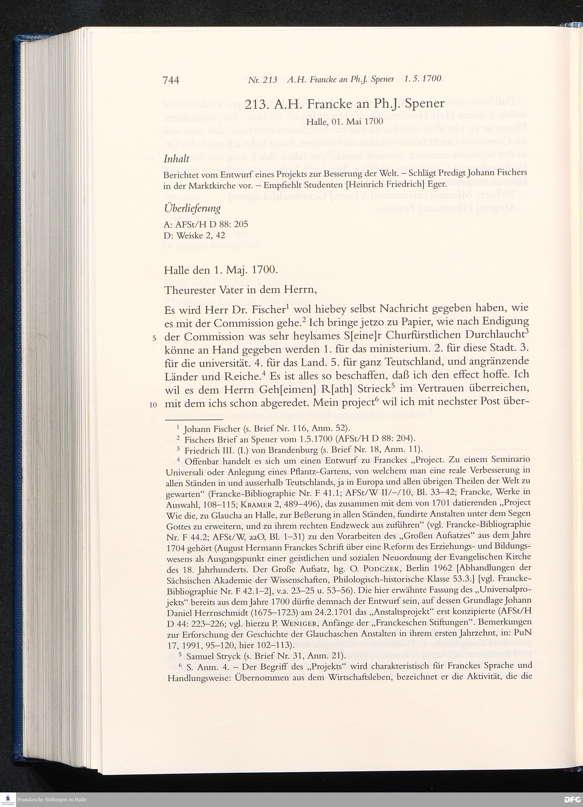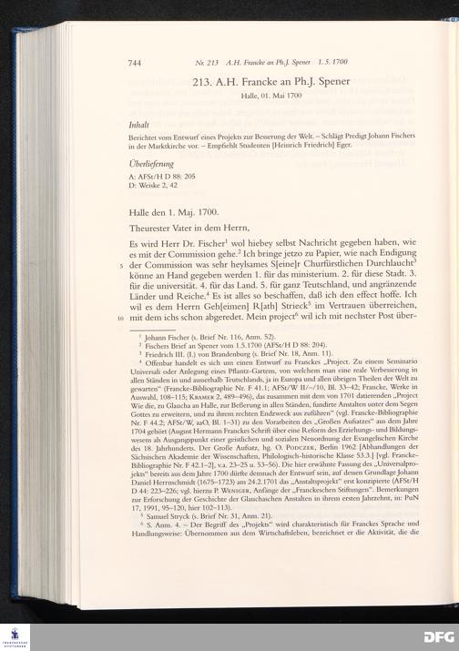 Nr. 213 A. H. Francke an Ph. J. Spener 01.05.1700