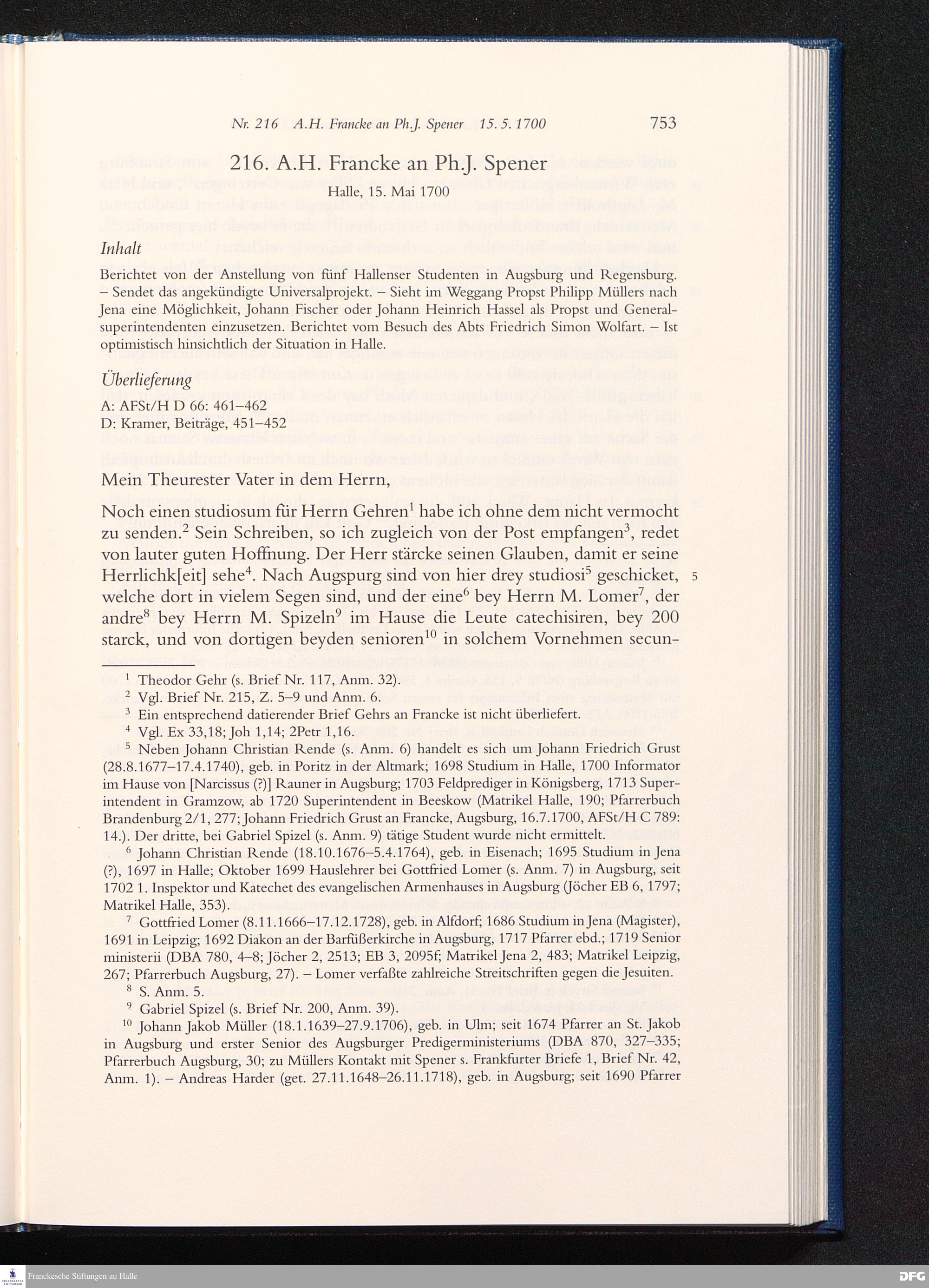 Nr. 216 A. H. Francke an Ph. J. Spener 15.05.1700
