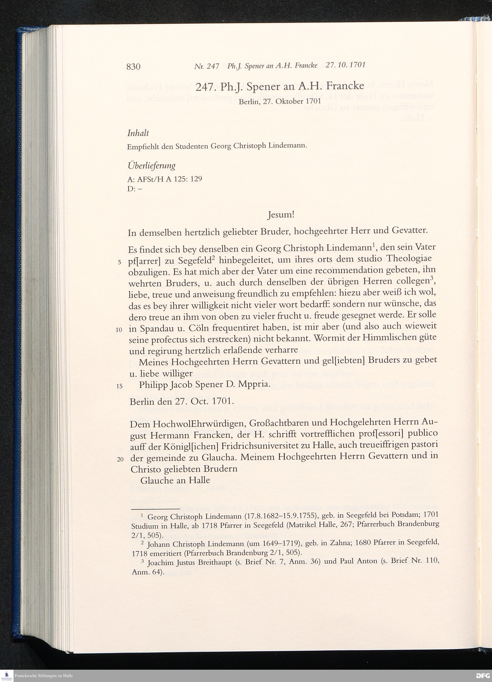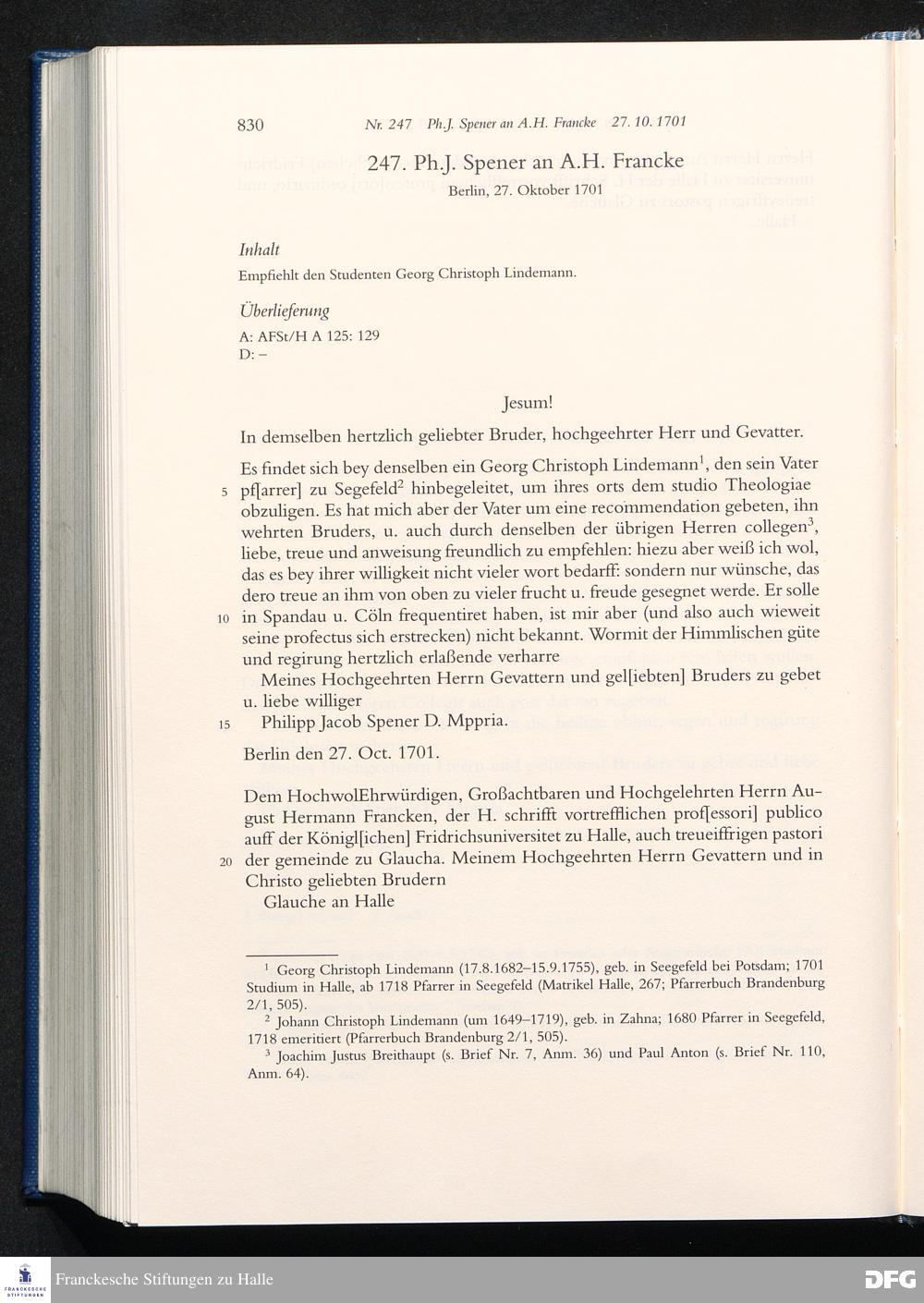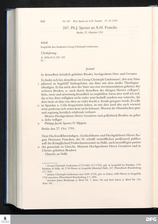 Briefwechsel mit August Hermann Francke : 1689 - 1704 / Philipp Jakob Spener. Hrsg. von Johannes Wallmann ... in Zsarb. mit Veronika Albrecht-Birkner