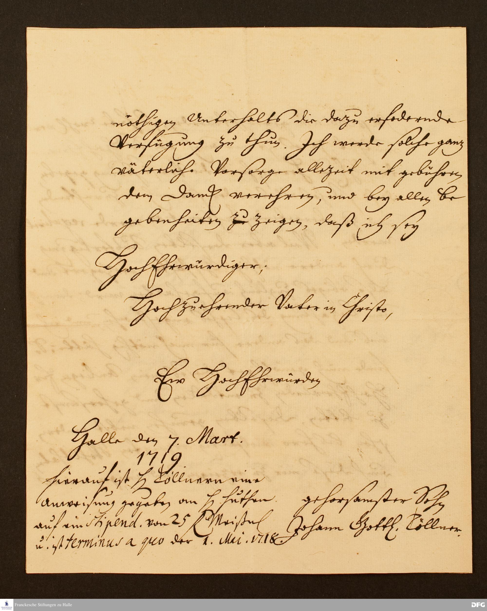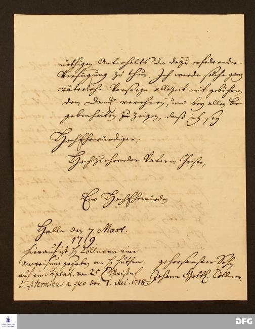Brief von Johann Gottlieb Töllner an August Hermann Francke.