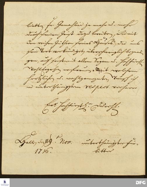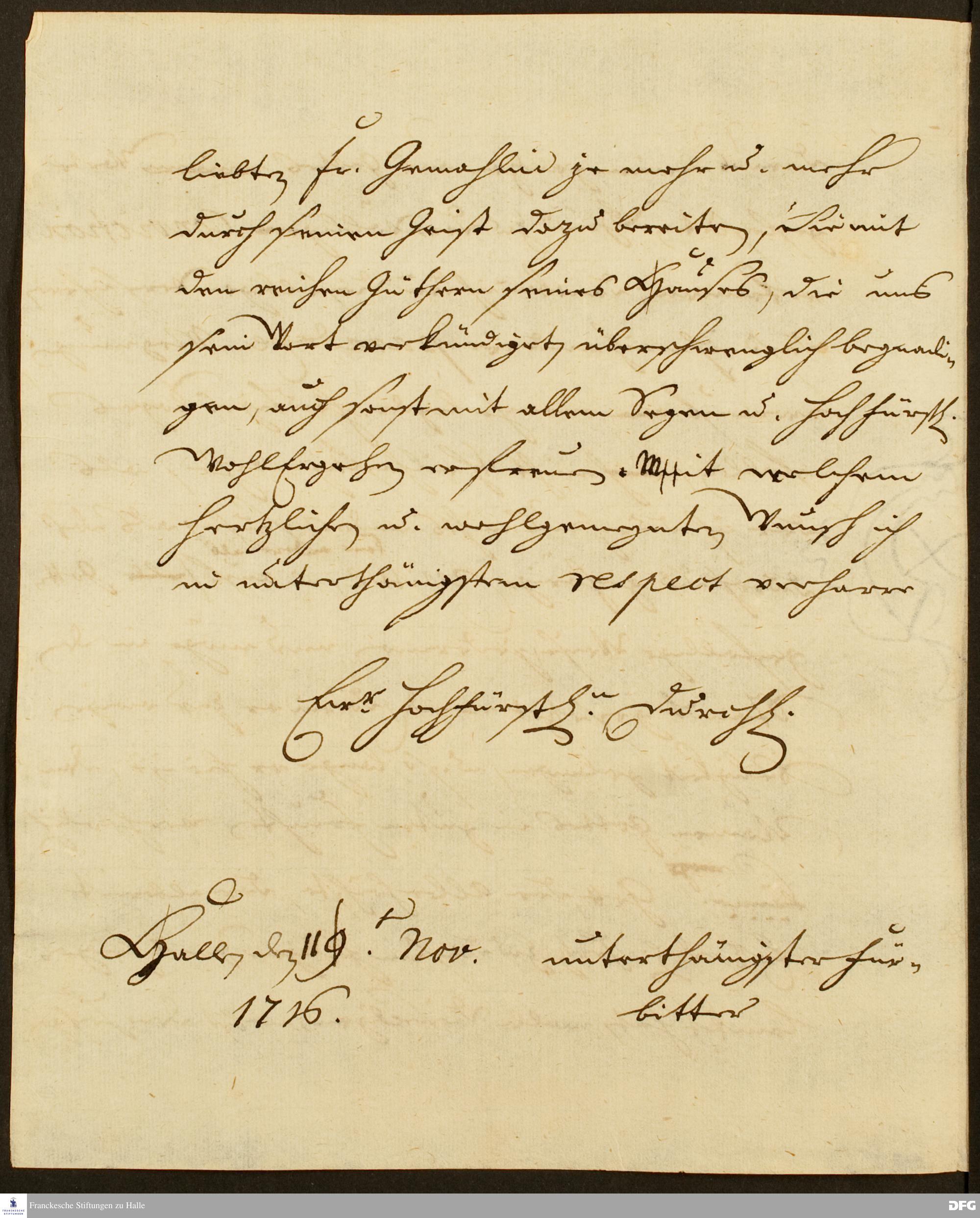 Teil eines Briefs von August Hermann Francke an Ernst Ferdinand v. Braunschweig-Wolfenbüttel-Bevern.