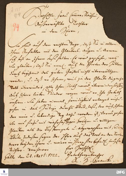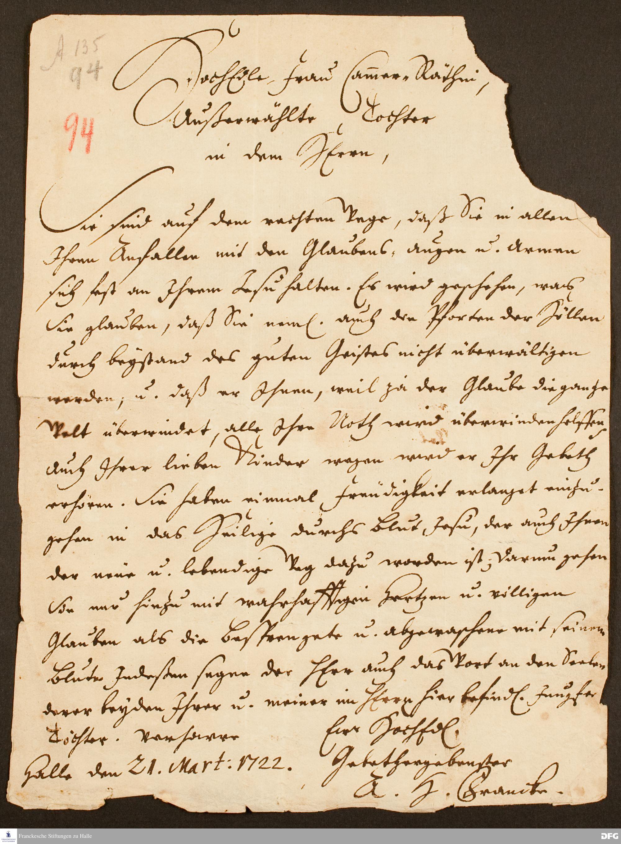 Brief von August Hermann Francke an Kammerrätin Zeibich.
