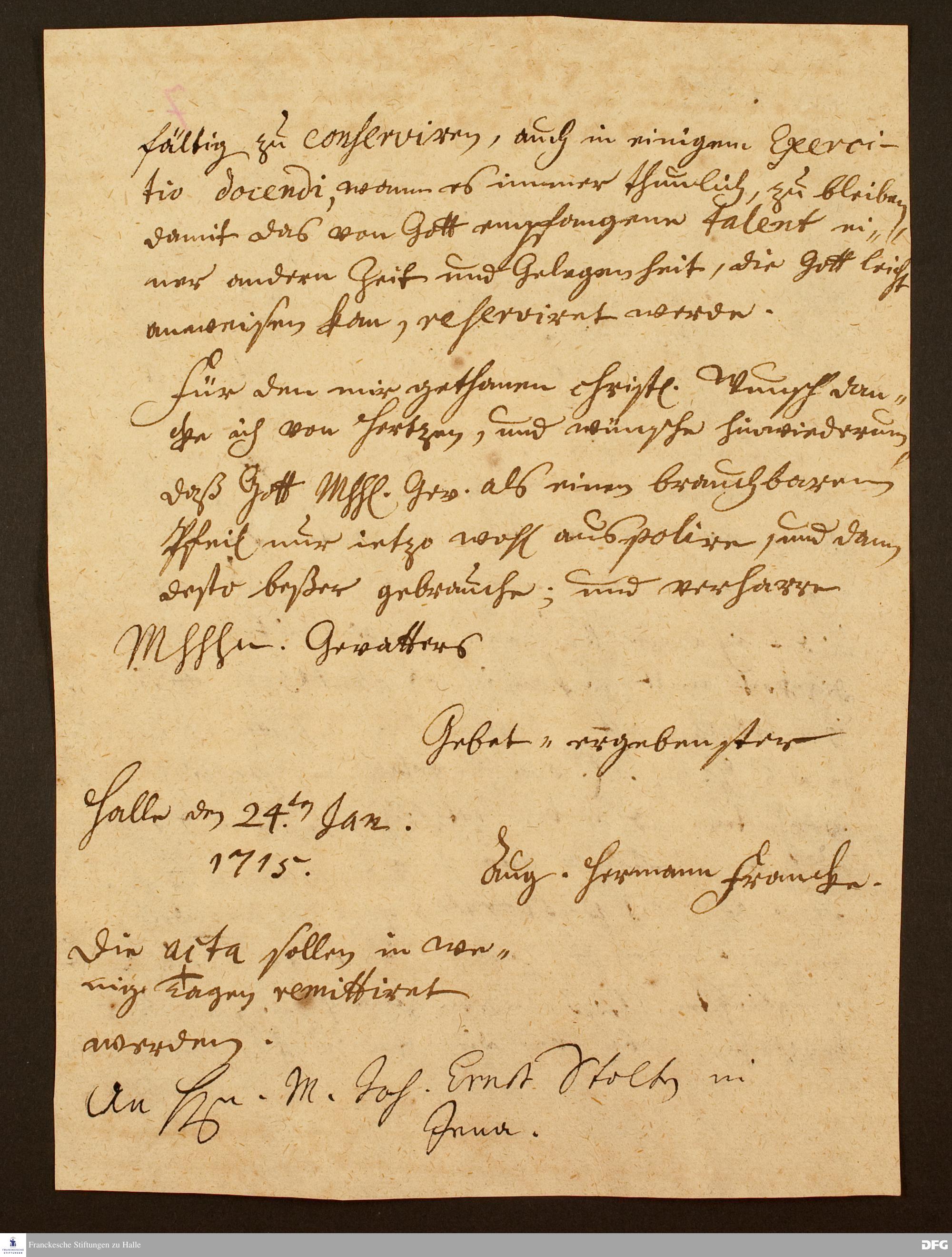 Brief von August Hermann Francke an Johann Ernst Stolte.