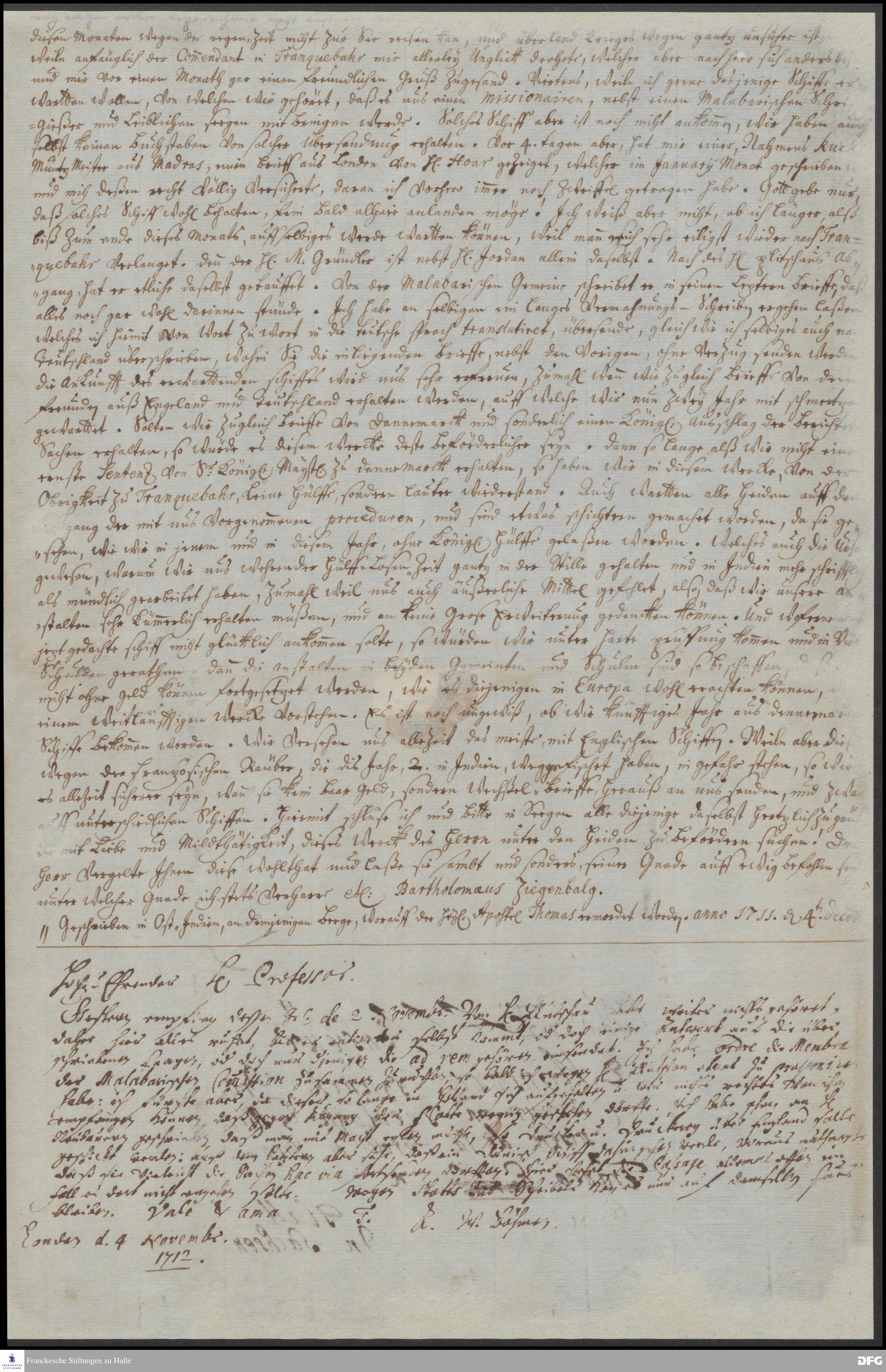 Brief von Bartholomäus Ziegenbalg an Anton Wilhelm Böhme.