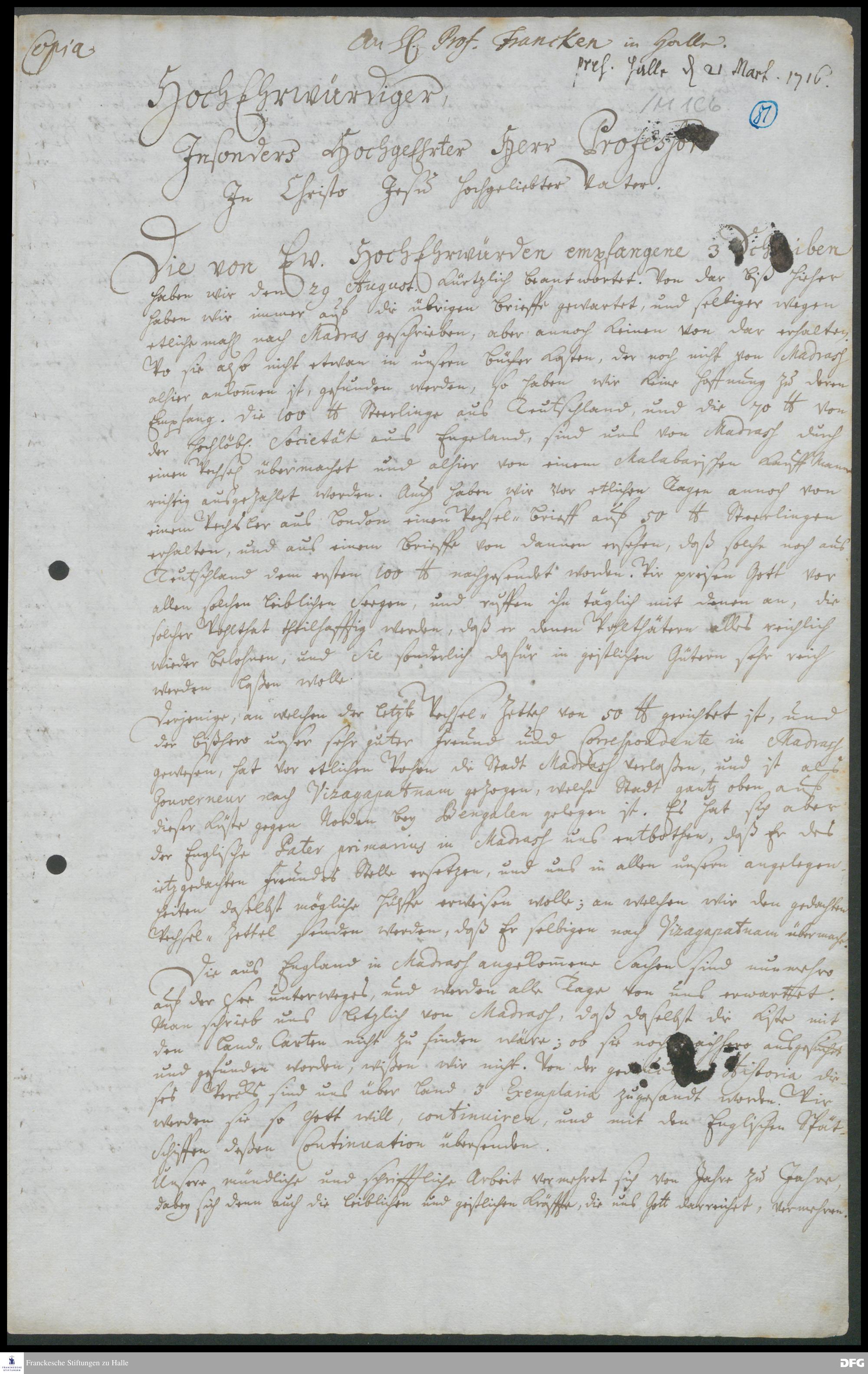 Brief von Bartholomäus Ziegenbalg und Johann Ernst Gründler an August Hermann Francke.