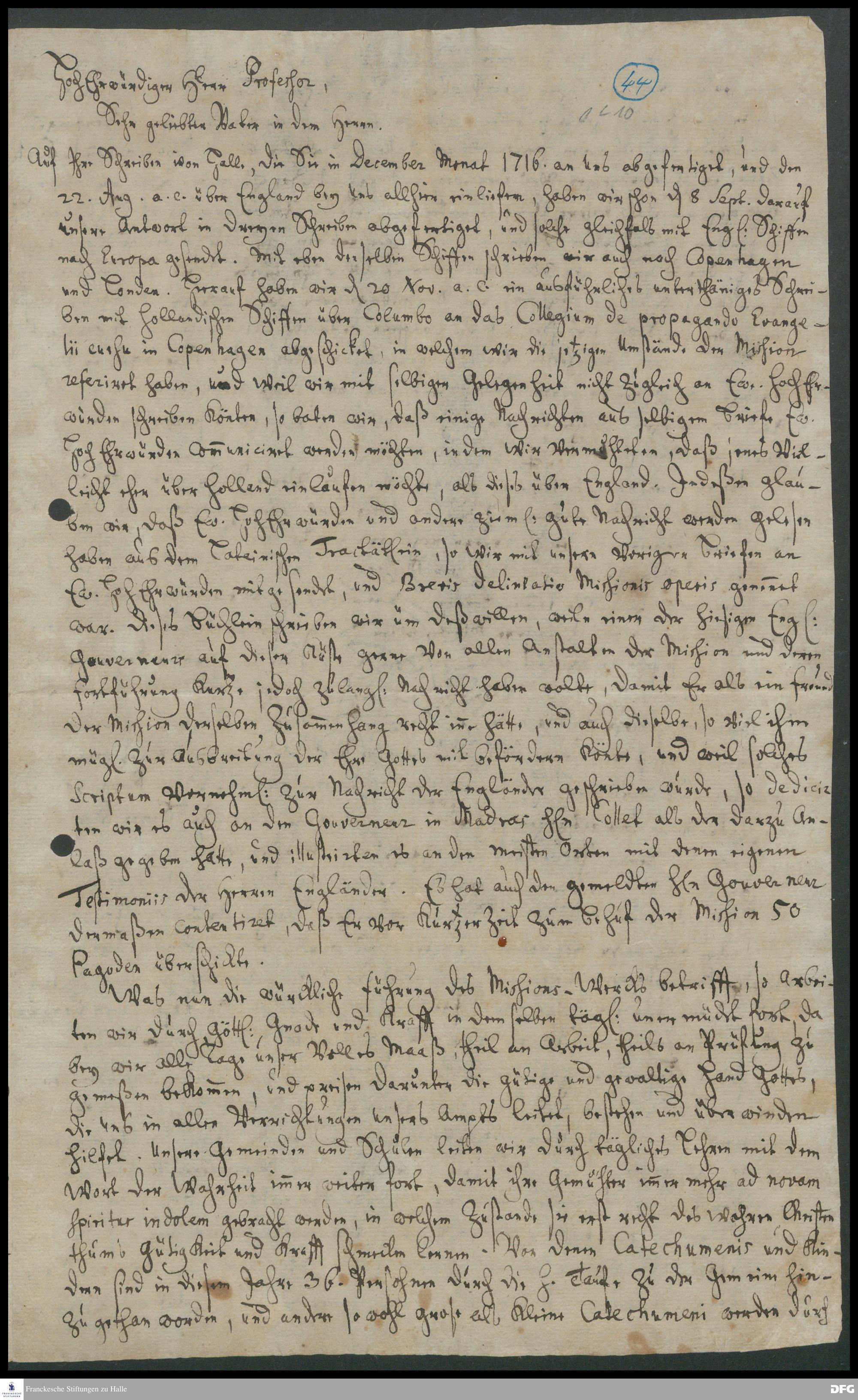 Brief von Bartholomäus Ziegenbalg und Johann Ernst Gründler an August Hermann Francke.