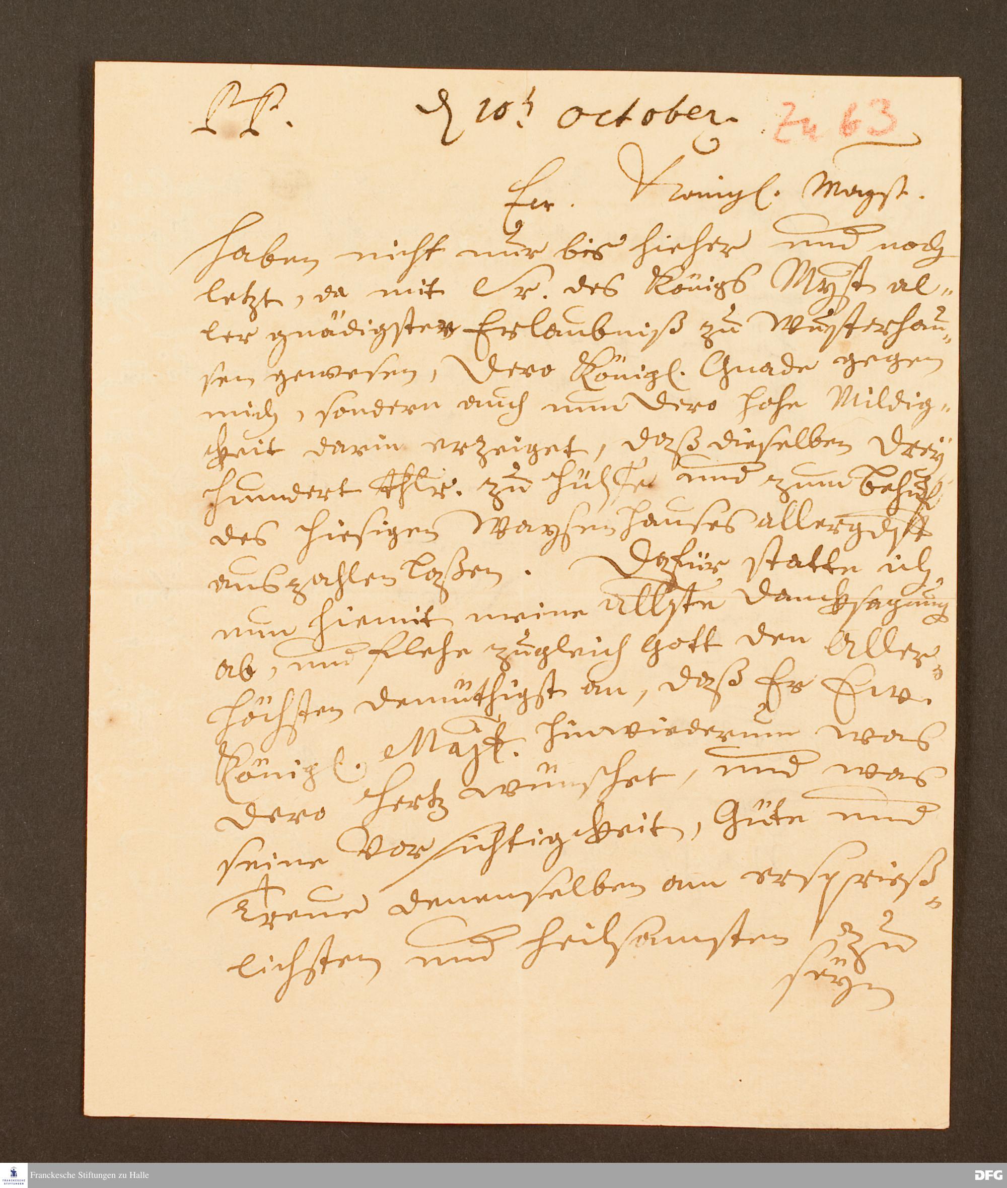 Brief von August Hermann Francke an Sophie Dorothea, Königin in Preußen.