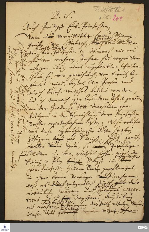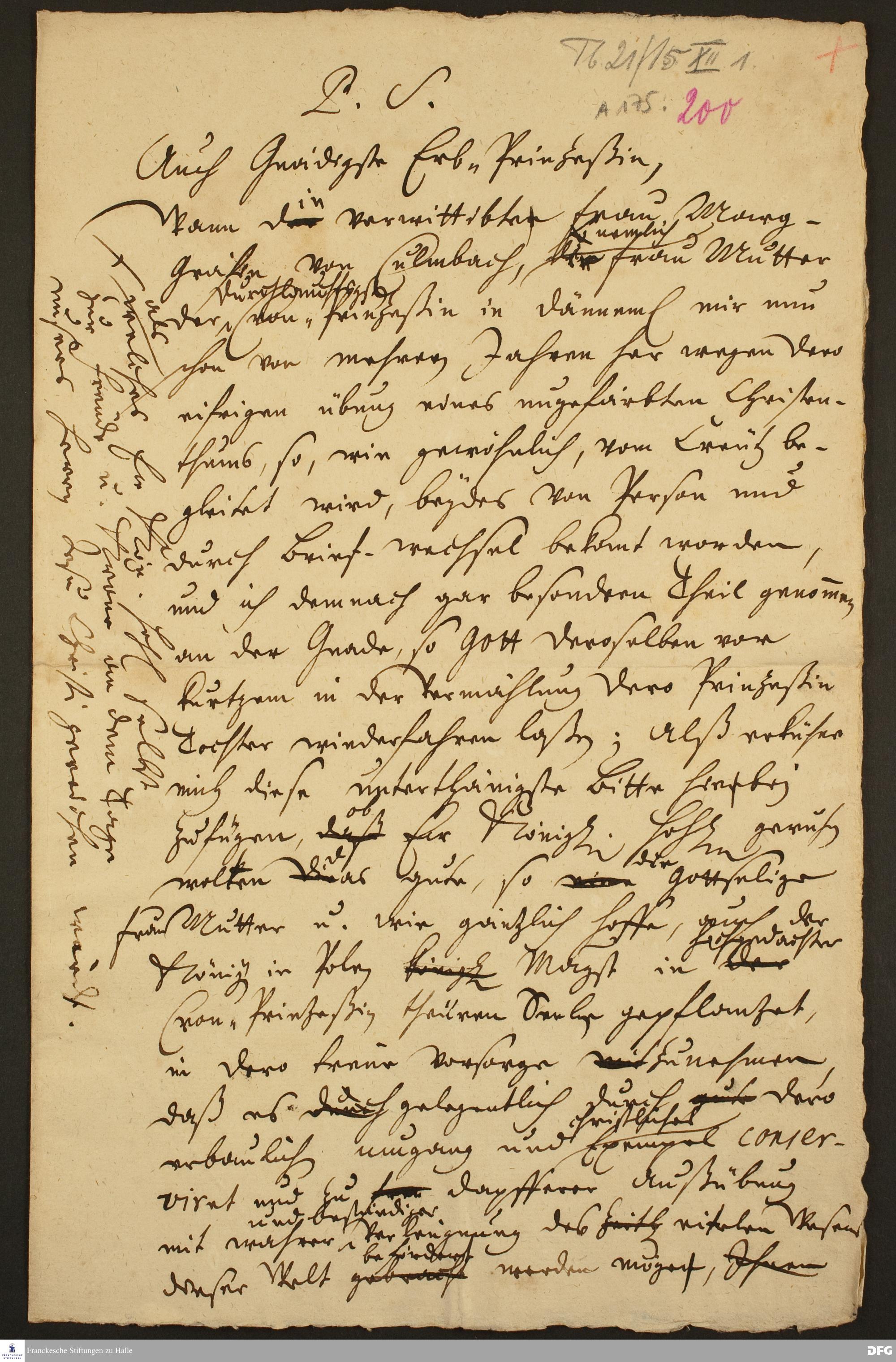 Postskriptum zu einem Brief von August Hermann Francke an Sophie Hedwig Prinzessin von Dänemark.