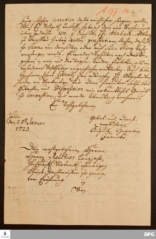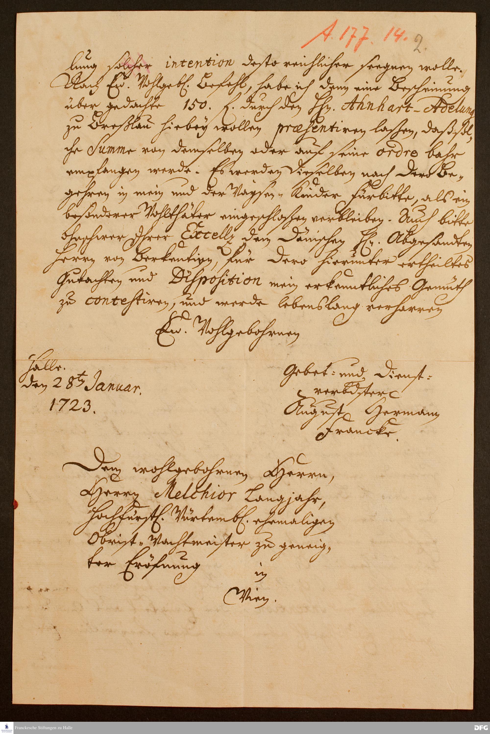 Brief von August Hermann Francke an Melchior Langjahr.
