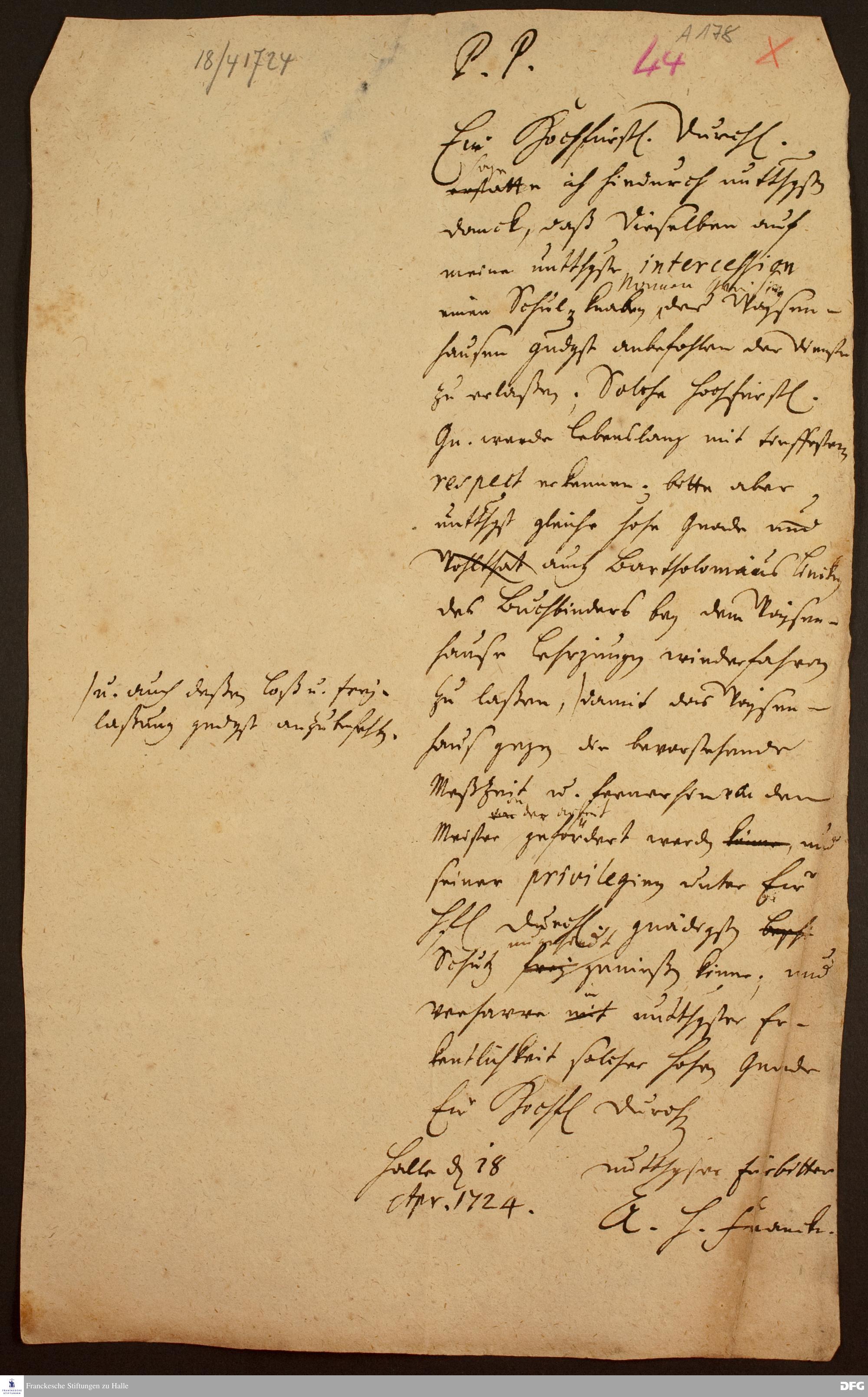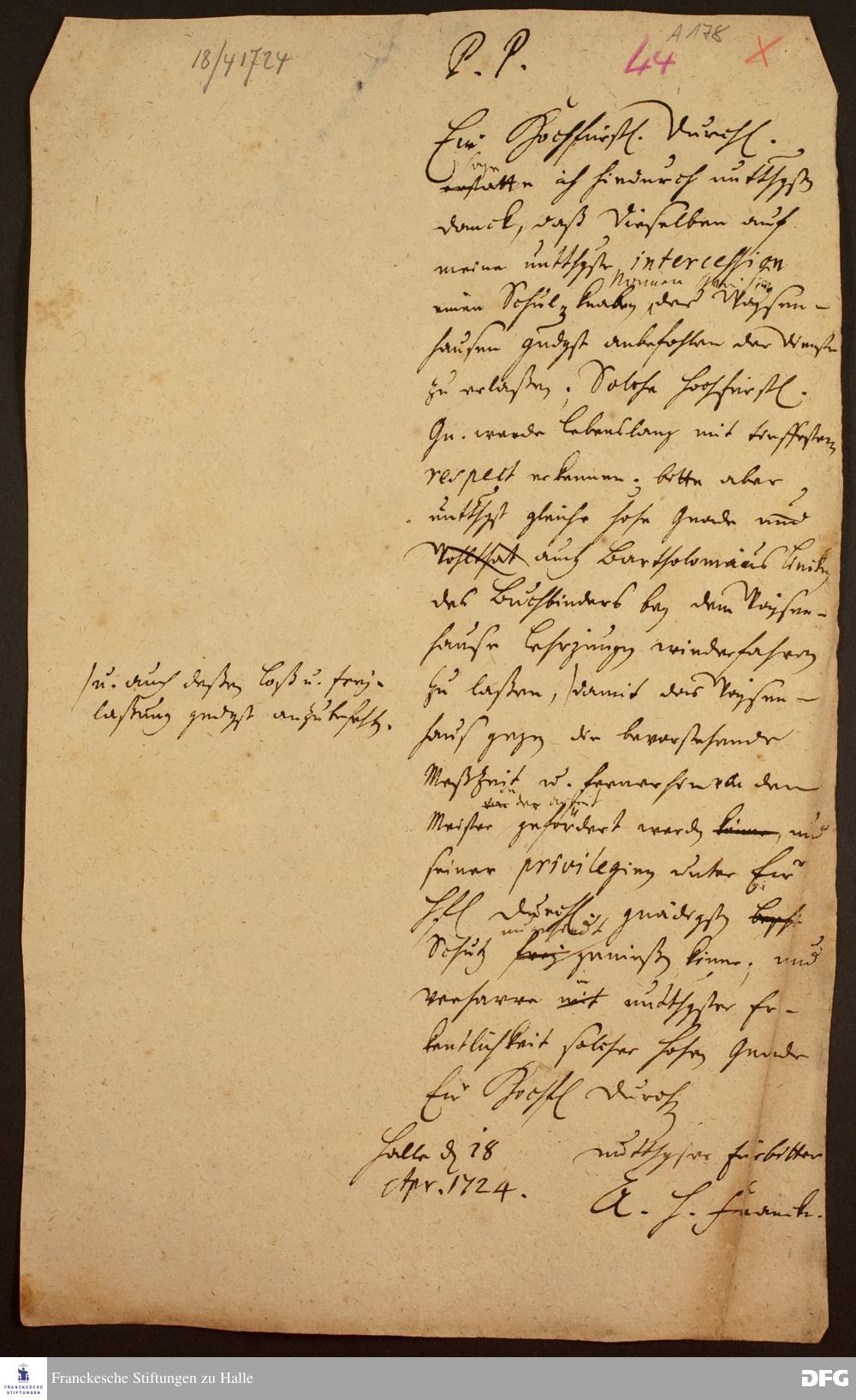Brief von August Hermann Francke an Leopold v. Anhalt-Dessau.