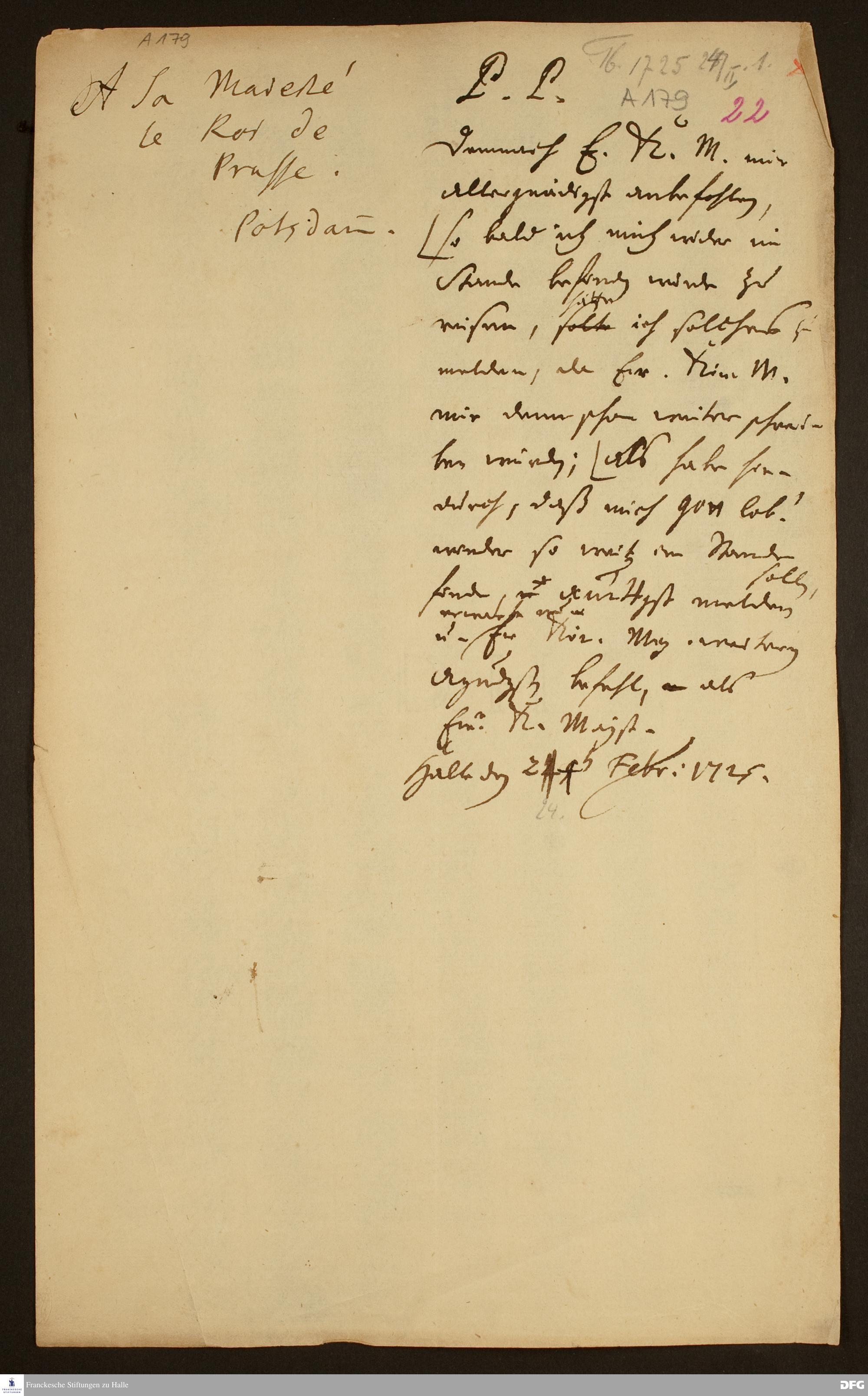 Brief von August Hermann Francke an Friedrich Wilhelm I., König in Preußen.