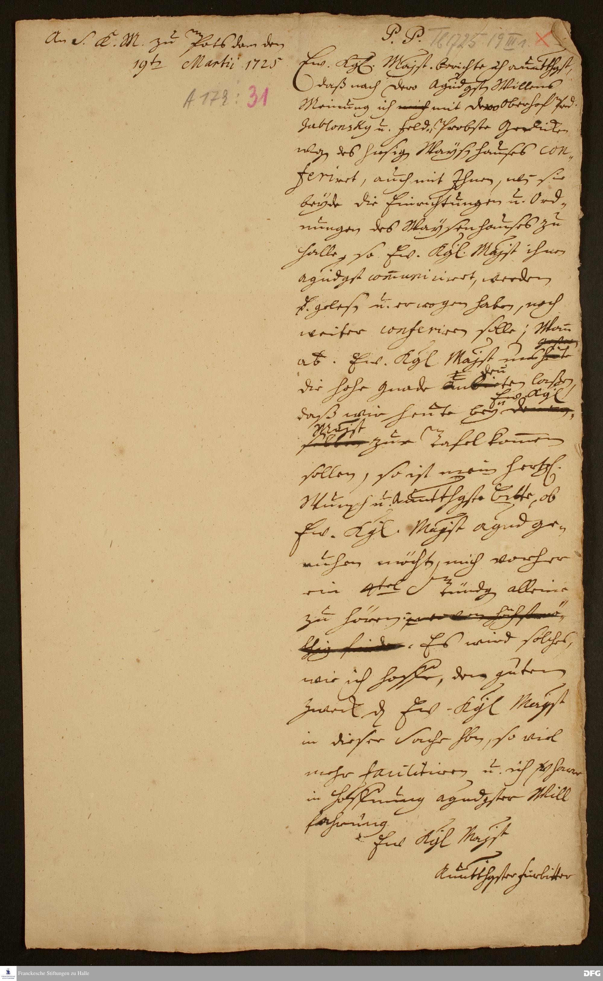 Brief von August Hermann Francke an Friedrich Wilhelm I., König in Preußen.