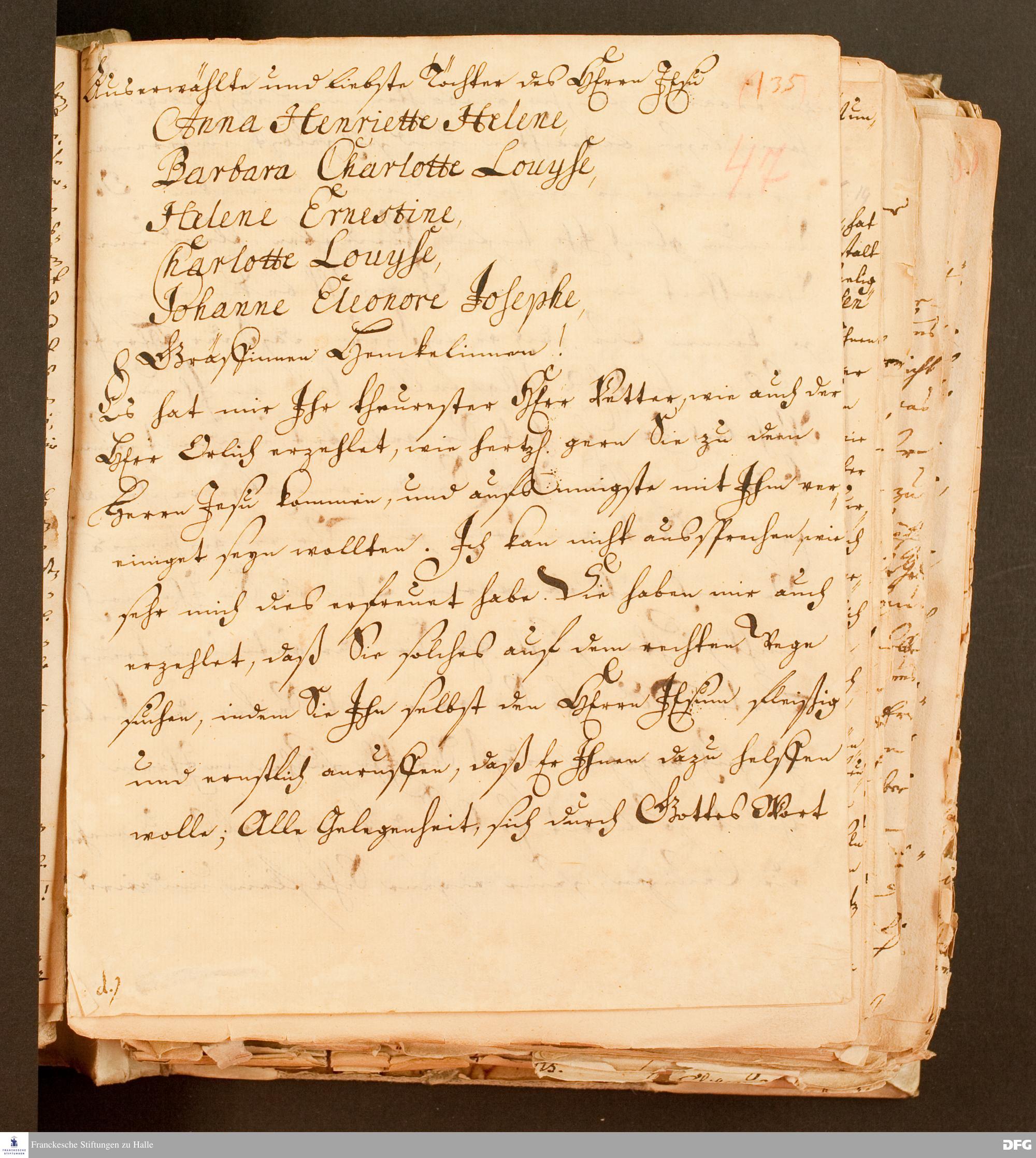 Brief von August Hermann Francke an Anna Helena Henriette Henckel v. Donnersmarck, Barbara Charlotte Luise Henckel v. Donnersmarck, Helene Ernestine Henckel v. Donnersmarck, Charlotte Luise Henckel v. Donnersmarck, Johanna Eleonore Josephe Henckel v. Donnersmarck.
