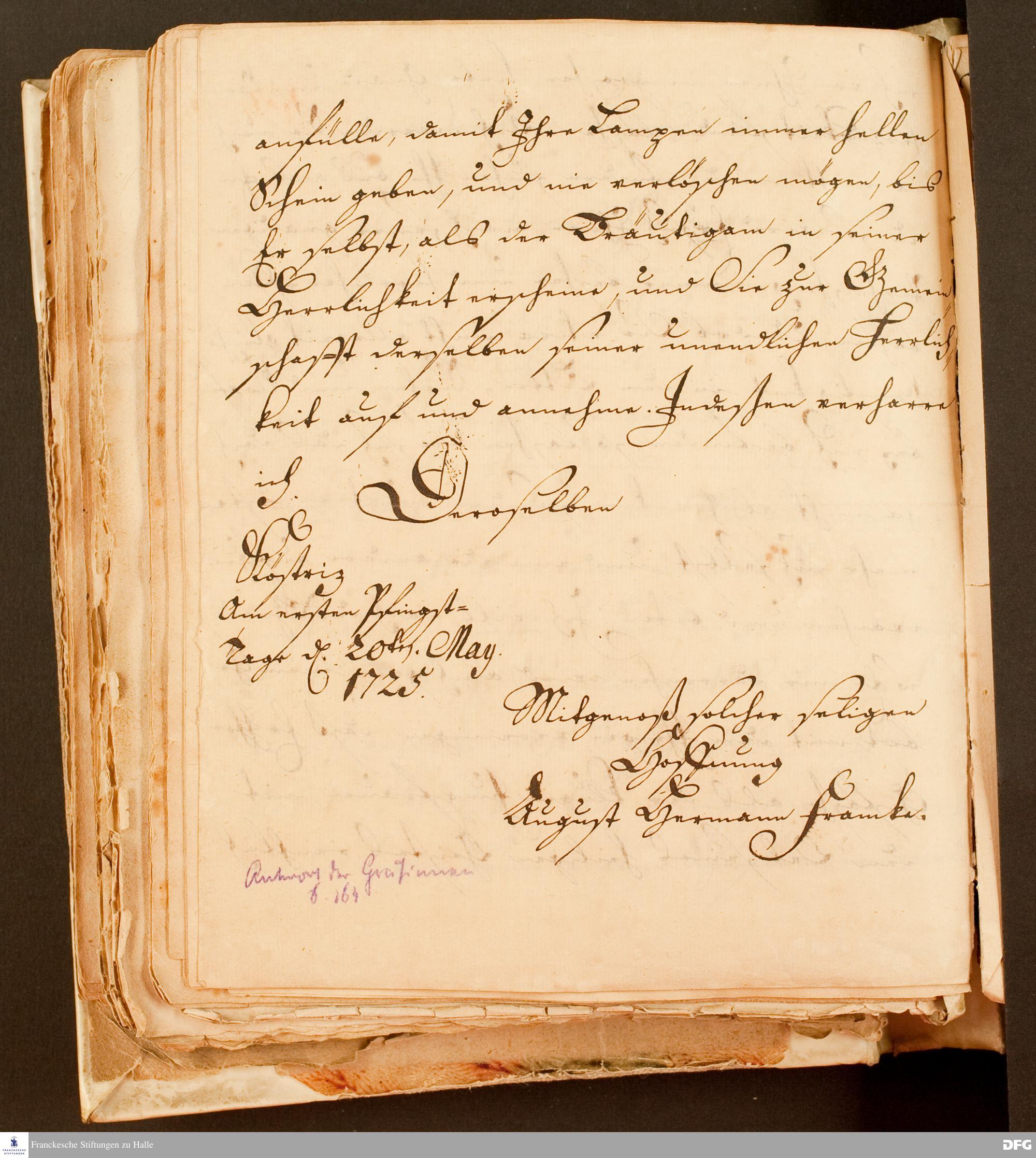 Brief von August Hermann Francke an Anna Helena Henriette Henckel v. Donnersmarck, Barbara Charlotte Luise Henckel v. Donnersmarck, Helene Ernestine Henckel v. Donnersmarck, Charlotte Luise Henckel v. Donnersmarck, Johanna Eleonore Josephe Henckel v. Donnersmarck.