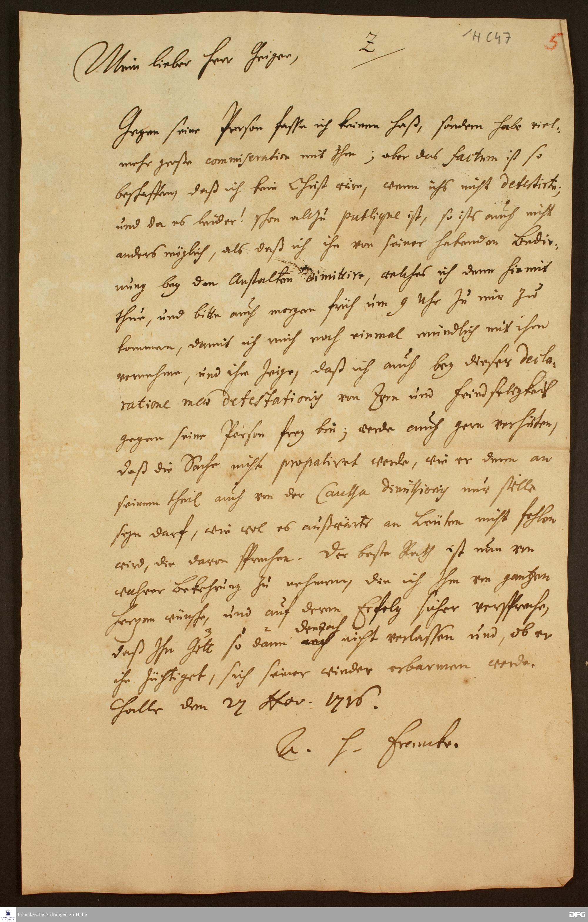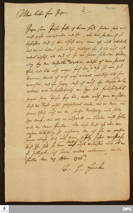 Brief von August Hermann Francke an Lucas Geiger.