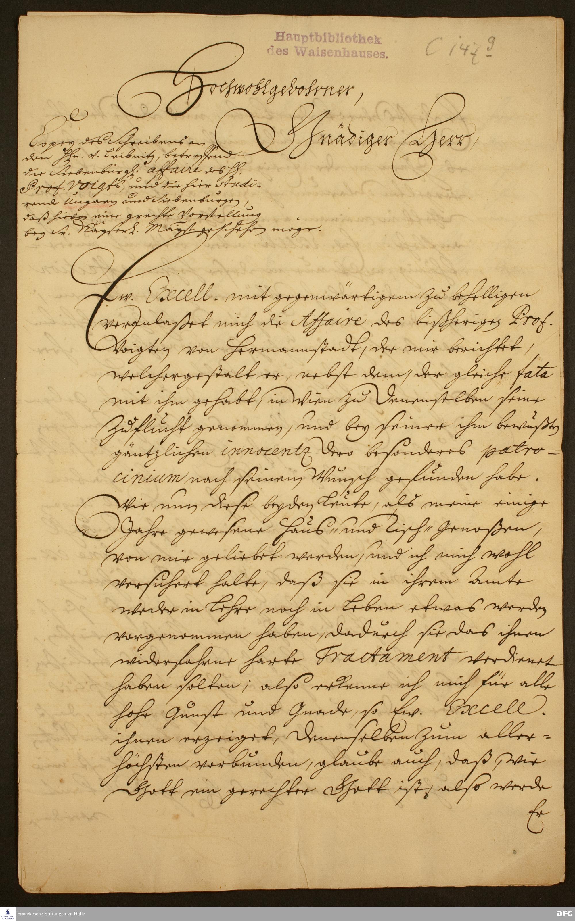Brief von August Hermann Francke an Gottfried Wilhelm Leibniz.