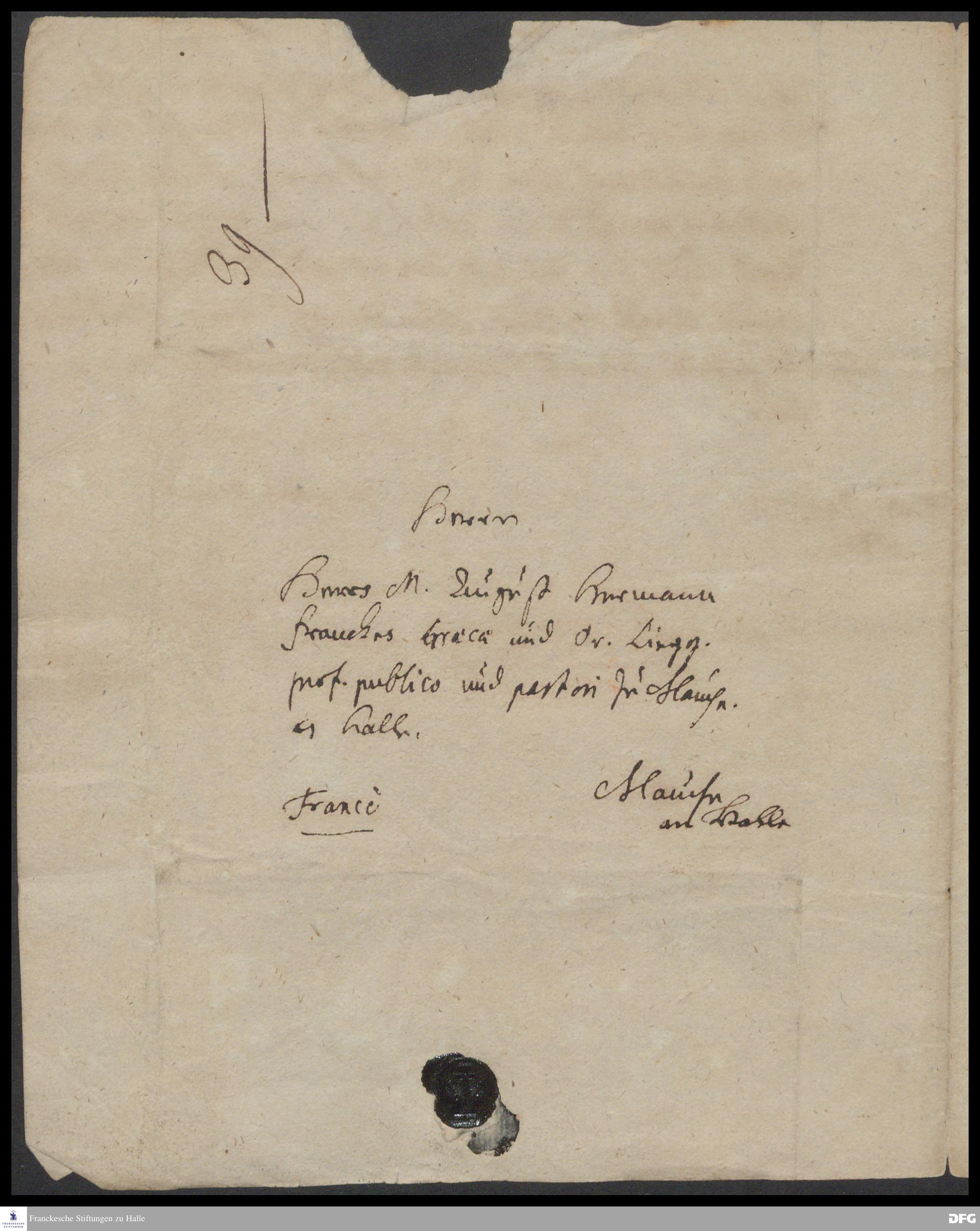 Brief von Philipp Jakob Spener an August Hermann Francke.