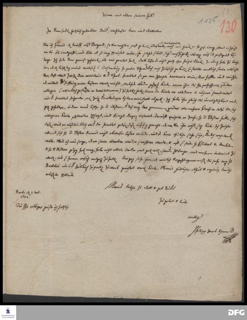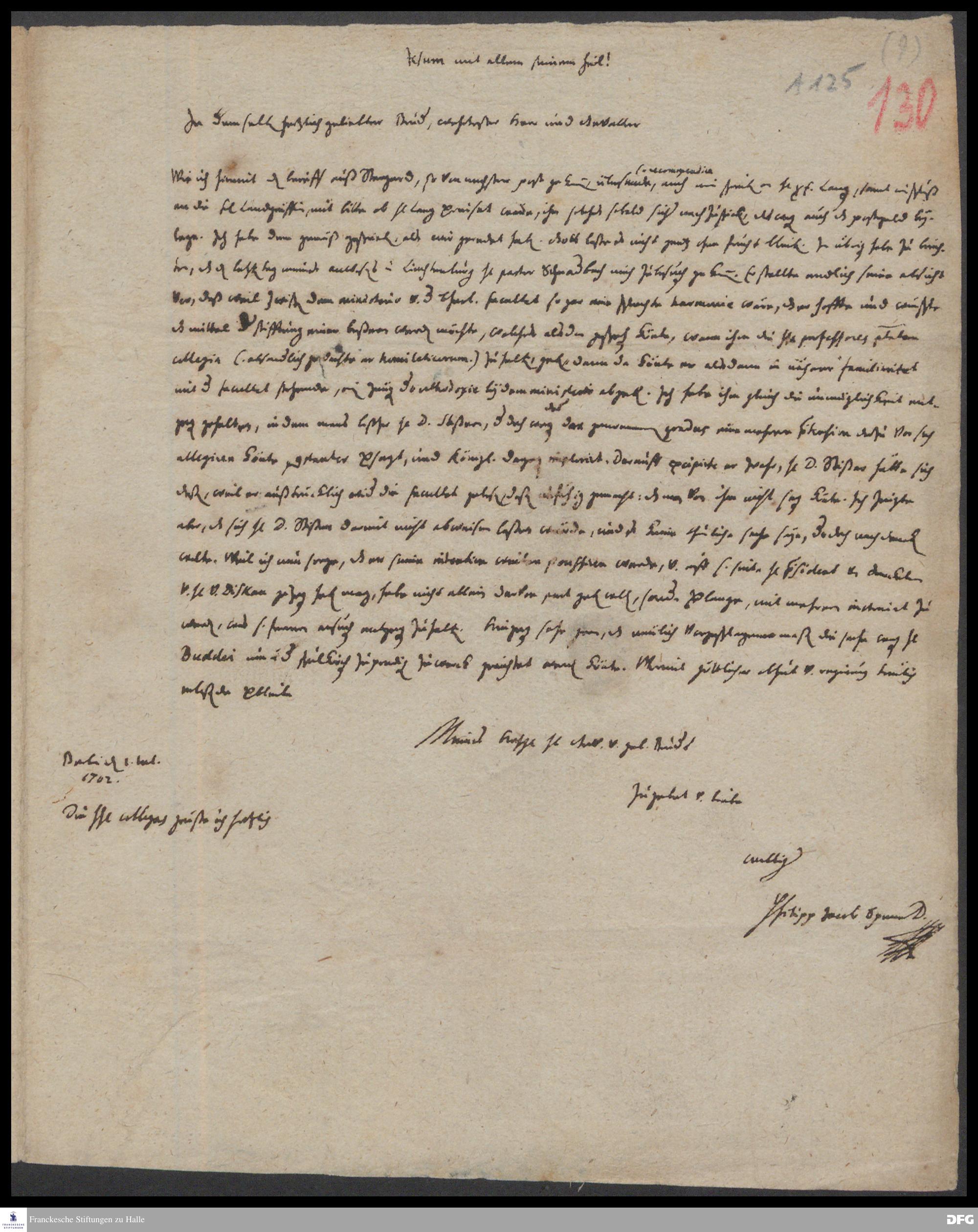 Brief von Philipp Jakob Spener an August Hermann Francke.