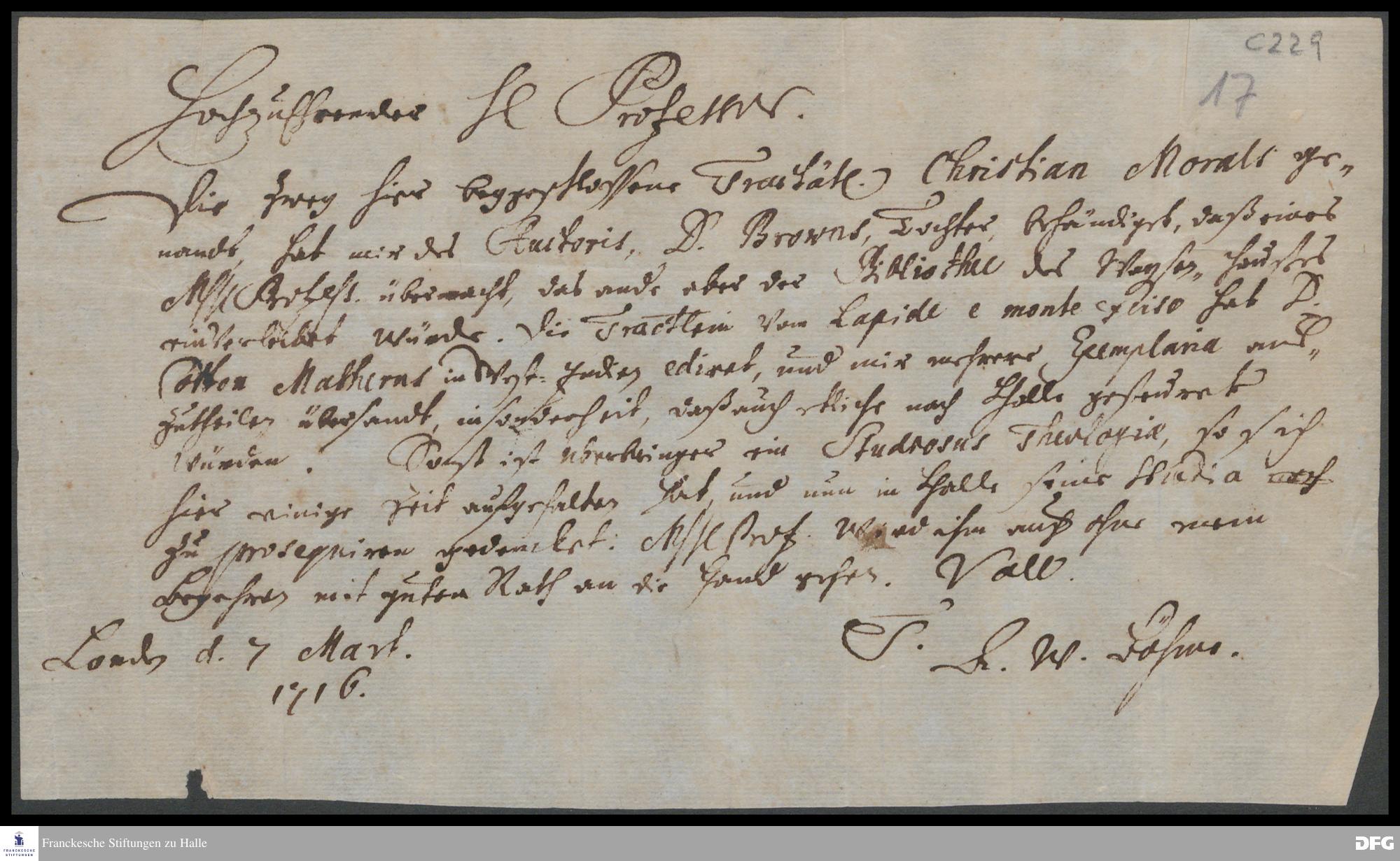 Brief von Anton Wilhelm Böhme an August Hermann Francke.