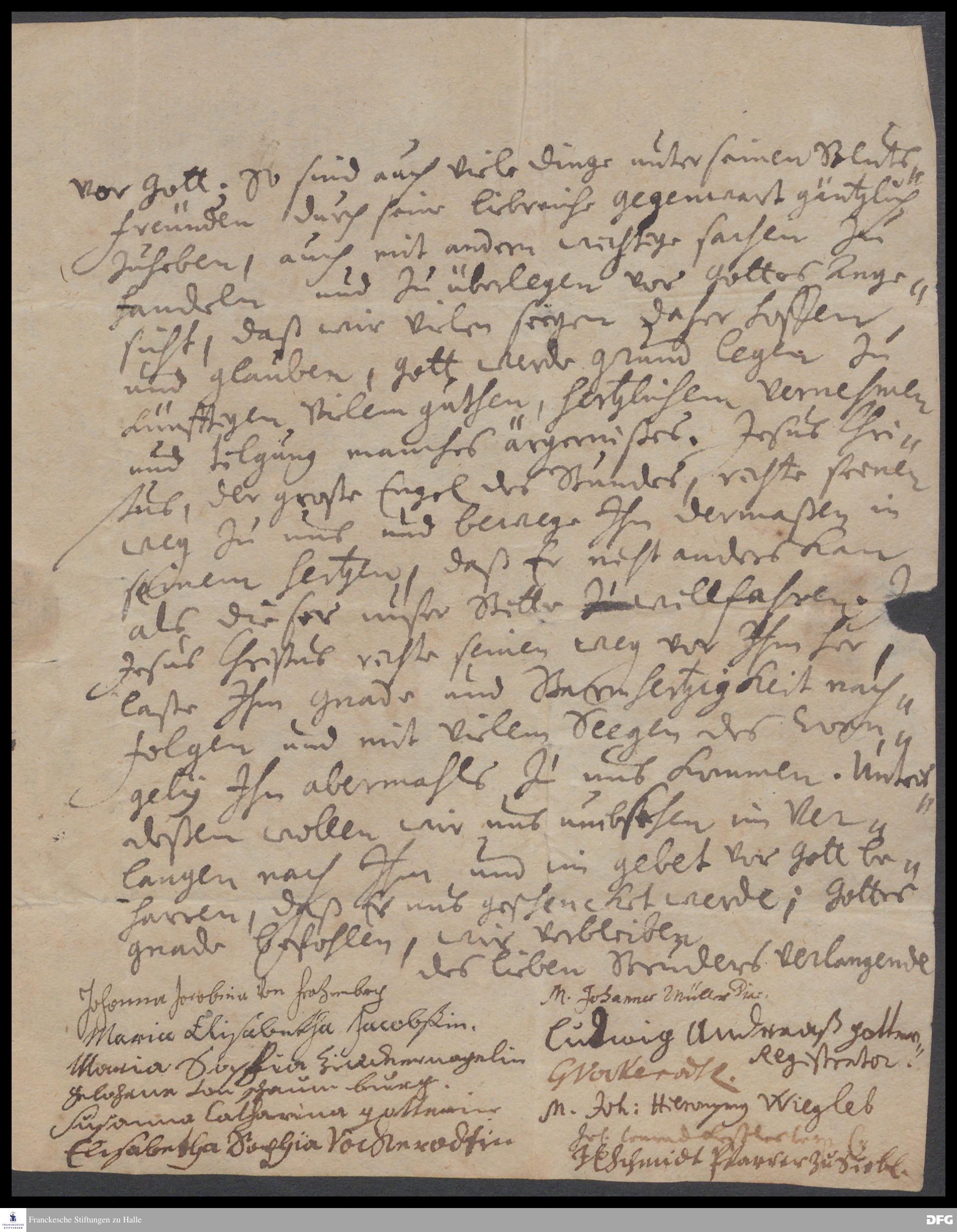 Brief von Johanna Jacobina von Herzenberg, Maria Elisabeth Jacobs, Susanna Catharina Gotter, Elisabetha Vockerodt, Johann Müller, Ludwig Andreas Gotter, Gottfried Vockerodt, Johann Hieronymus Wiegleb, Johann Conrad Keßler und Johann Eusebius Schmidt an August Hermann Francke.