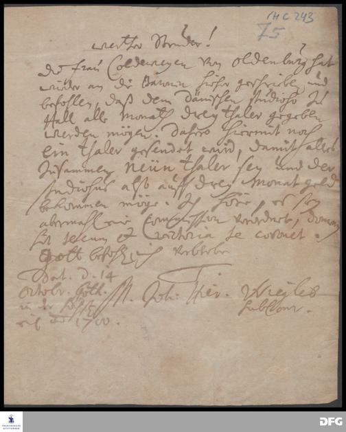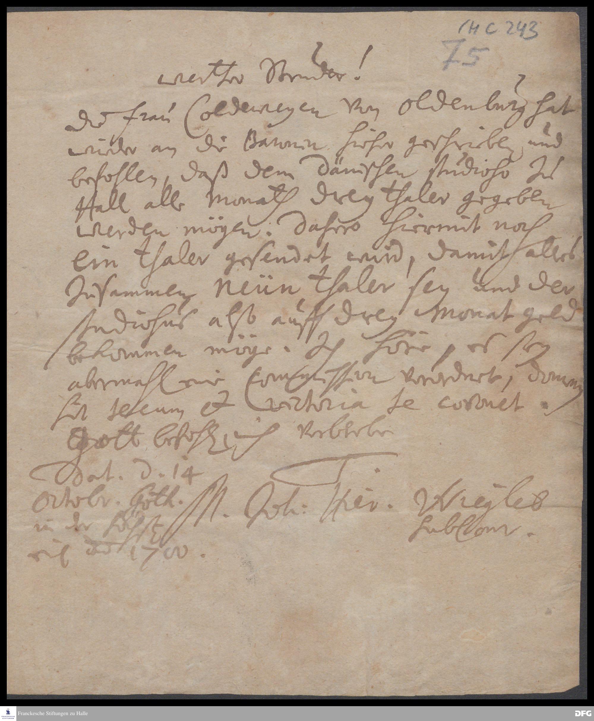 Brief von Johann Hieronymus Wiegleb an August Hermann Francke.