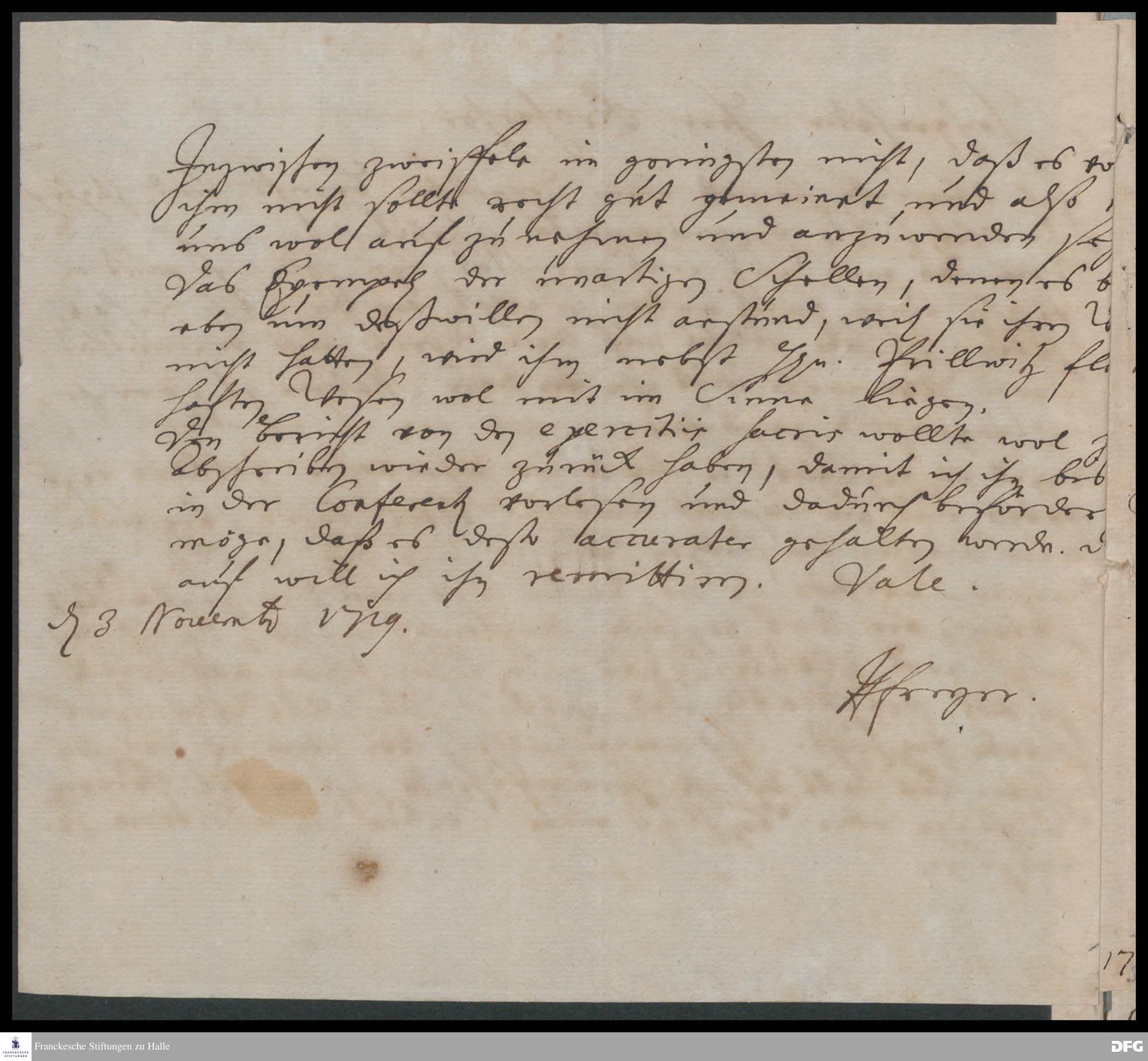 Brief von Hieronymus Freyer an August Hermann Francke.