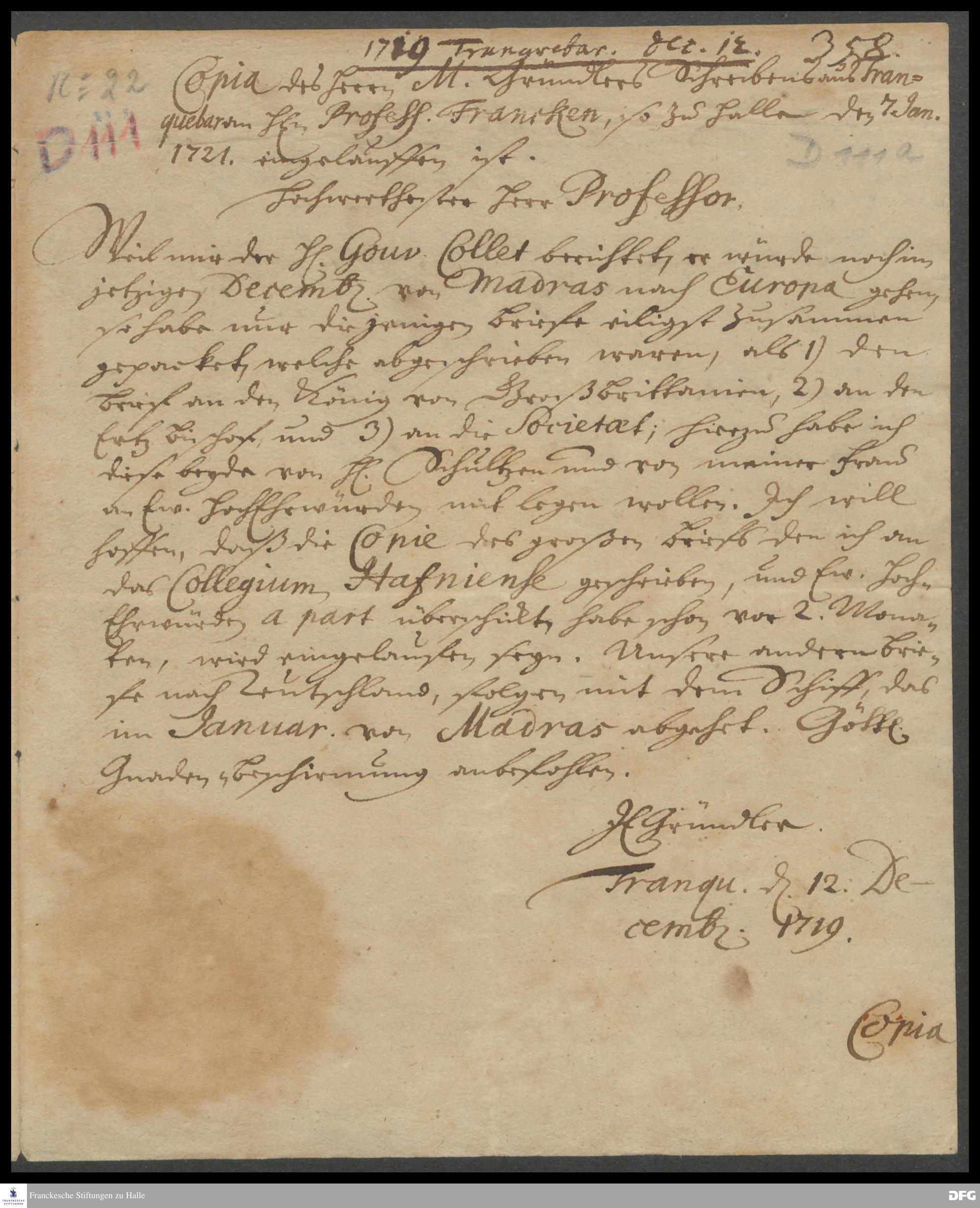 Brief von Johann Ernst Gründler an August Hermann Francke.
