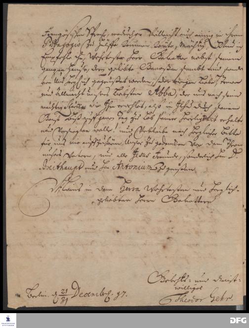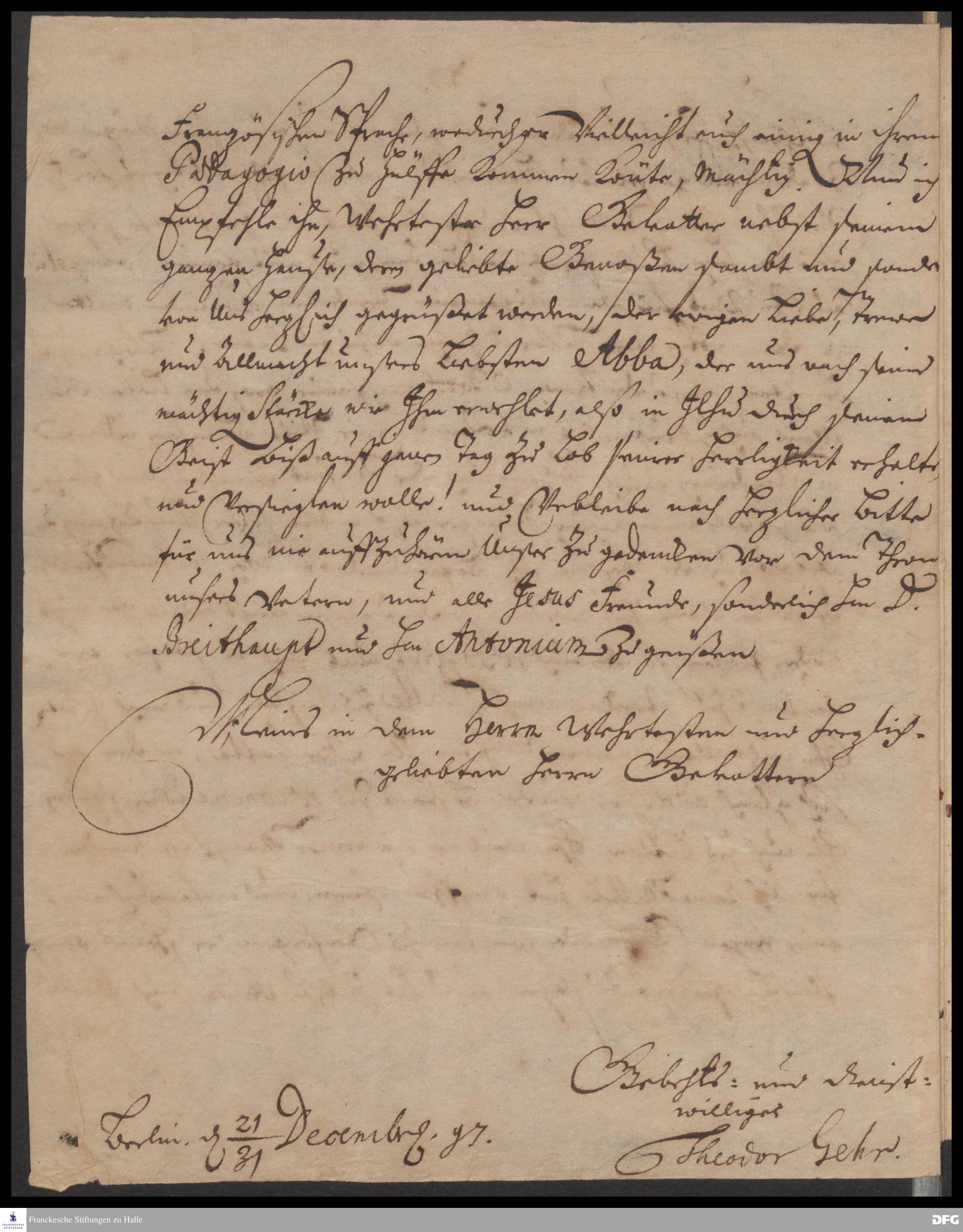 Brief von Theodor Gehr an August Hermann Francke.