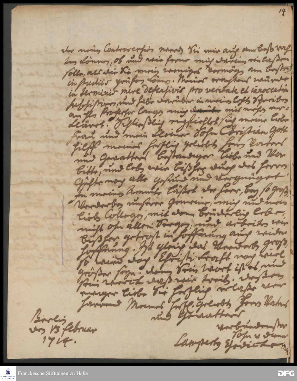 Brief von Lampertus Gedicke an August Hermann Francke.