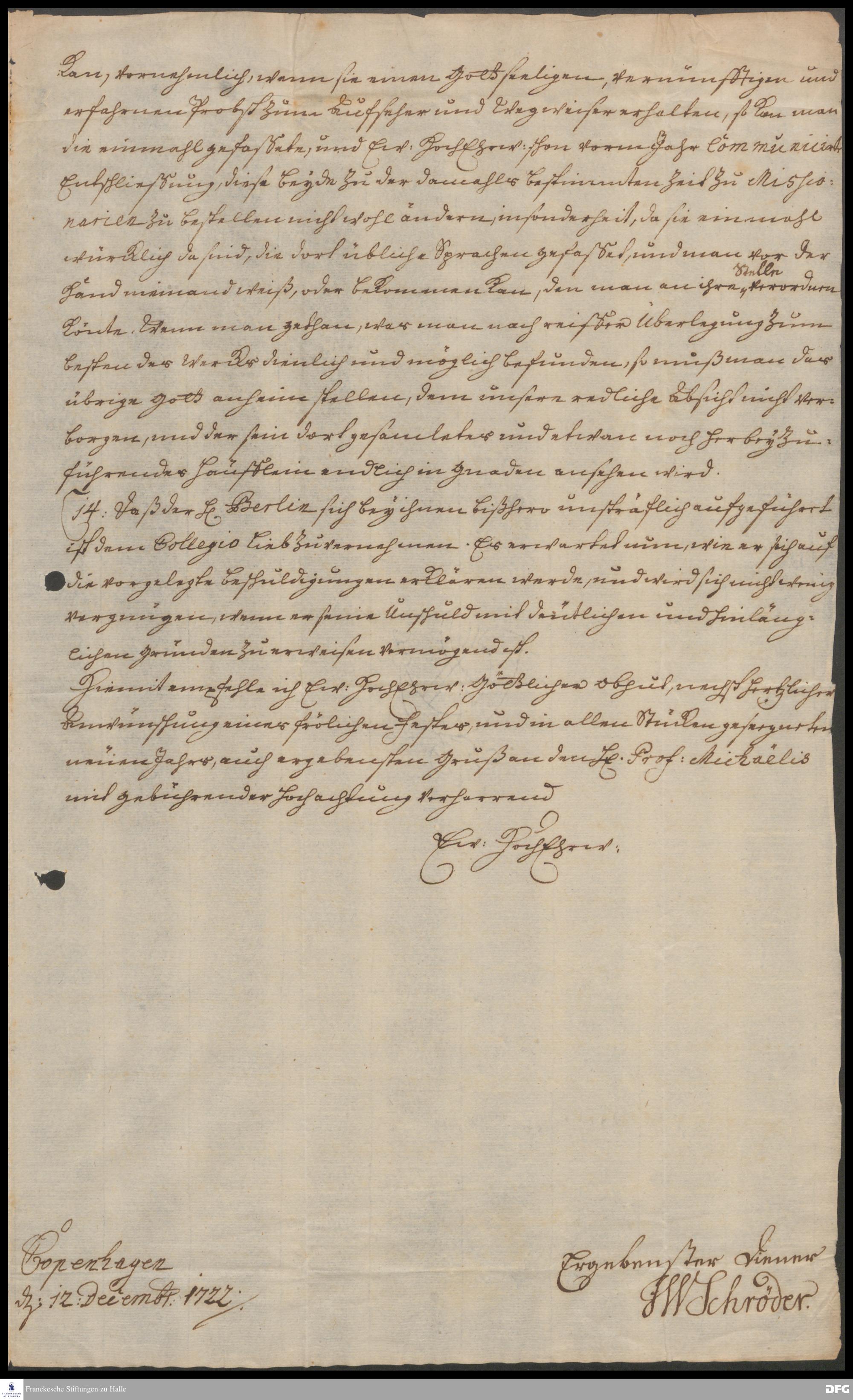 Brief von Johann Wilhelm Schröder an August Hermann Francke.