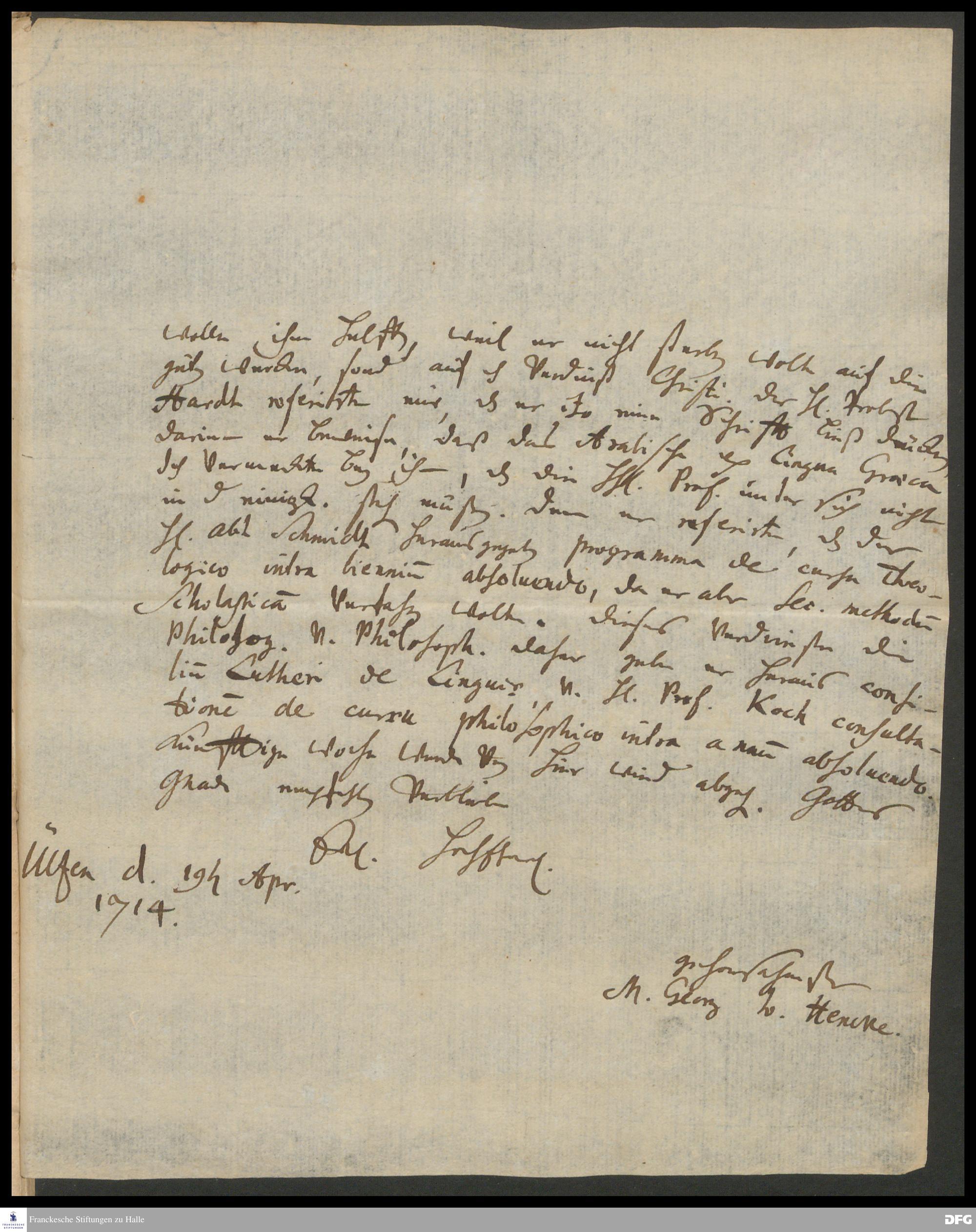 Brief von Georg Johann Hencke an August Hermann Francke.