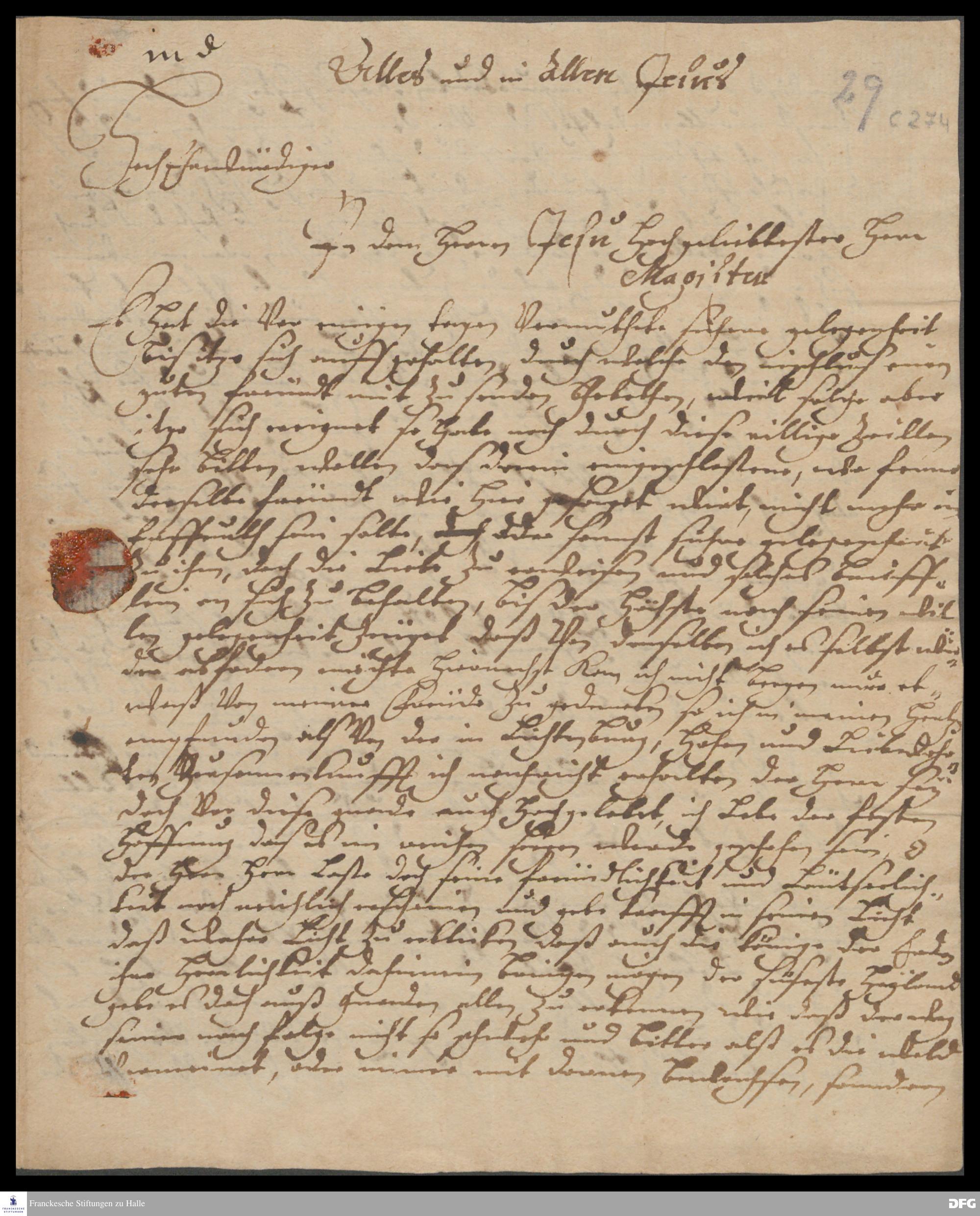 Brief von Sophia Maria v. Stammer an August Hermann Francke.